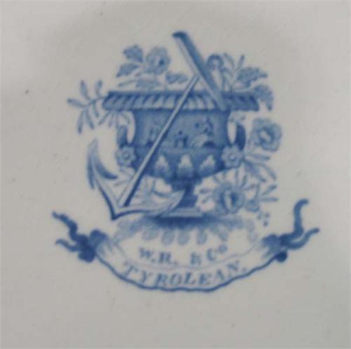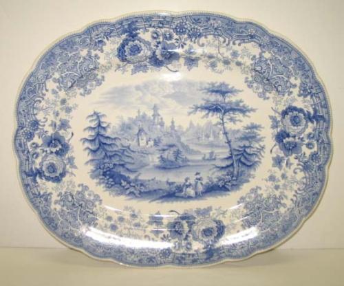 BLUE & WHITE TRANSFERWARE PLATTER. Ridgway Pottery (William, 1830-1854). Decorated with man and woman along river. Marked on reverse “Tyrolean”. 14.5” L