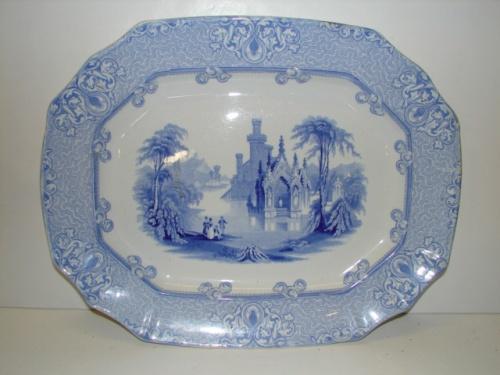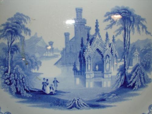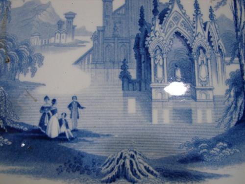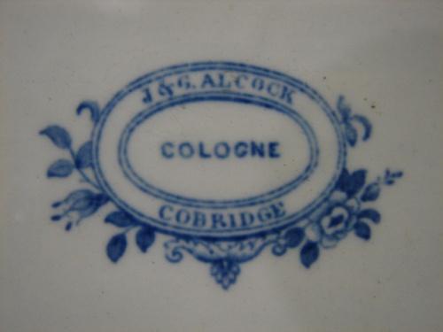 BLUE & WHITE TRANSFERWARE PLATTER. Depicts a scene along a river with buildings and people. Marked on reverse “J. & G. Alcock/Cologne/Cobridge”. Shows a small amount of red paint staining on reverse. 10.75” W