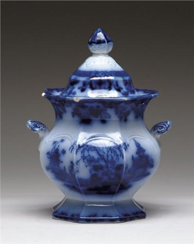 BLUE WILLOW COVERED SUGAR IN THE ""SCINDE"" PATTERN. SIZE: 8-1/4in. h. CONDITION: Chips and roughness to outside and inside rim, otherwise good. 9-25810