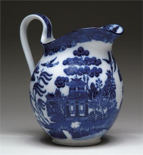 BLUE WILLOW LARGE HANDLED PITCHER BY DOULTON BURSLEM. Bulbous pitcher with wide spout, blue mark to base. SIZE: 11in. h. CONDITION: Very good. 9-25811
