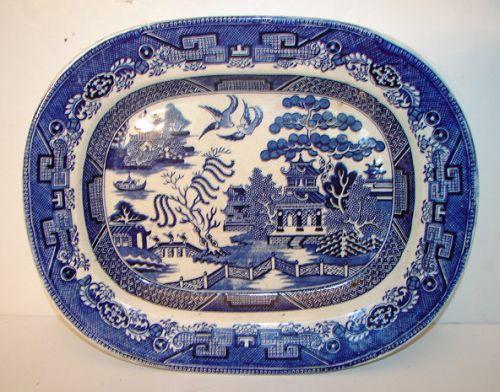 BLUE WILLOW PORCELAIN PLATTER. Depicts an Oriental scene with building along river. No mark. Shows signs of crazing throughout. 14” L
