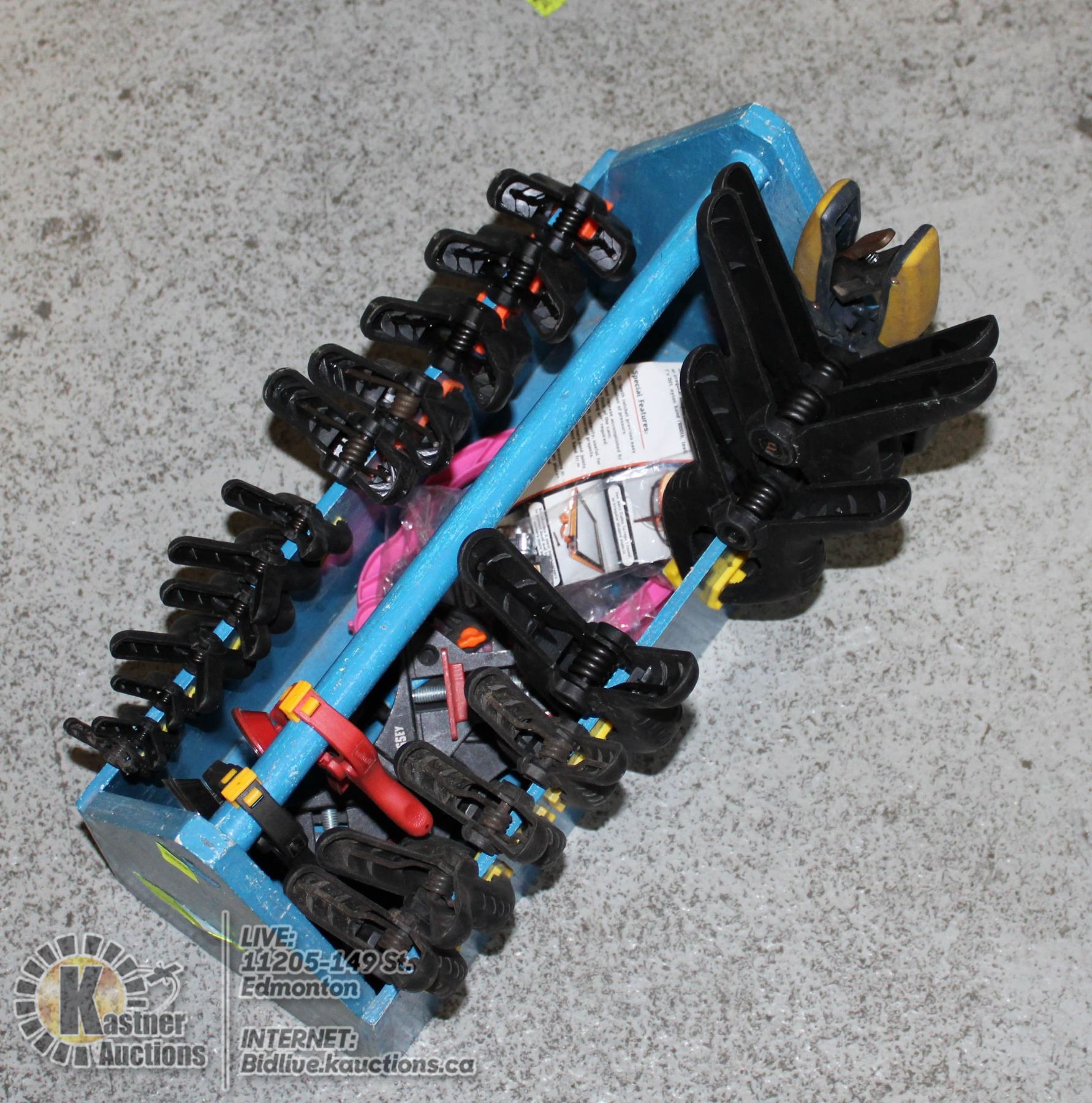 VARIOUS TYPES OF CLAMPS INCL. 20 STANDARD CLAMPS (VARIOUS SIZES), 2 BESSY METAL CORNER CLAMPS, PONY BAND CLAMP - 1 INCH X 15 FT. NYLON 1000 LB TEST, MASTERCRAFT HAND RATCHET CLAMP, 2 SUCTION CUP CLAMPS, ETC.