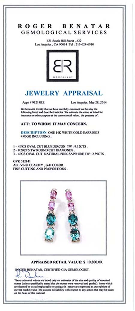 BLUE ZIRCON 9.12CT / PINK SAPPHIRE 2.39CT, 14K W/G EARRING 4.03GRAM / DIAMOND 0.20CT