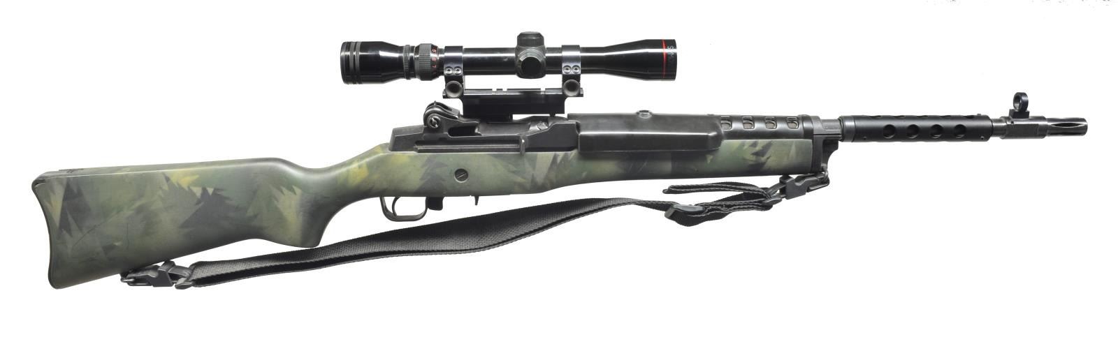 Cal. 223. S# 186-34763. Bbl. 18". Blued version of the time honored Mini-14 series w/ hardwood camouflage pattern. B-Square scope mount & Simmons 3-9x32 scope. Ventilated hand guard from factory w/ aftermarket ventilated bbl. shroud & flash hider w/ aftermarket protected post front sight. Sling swivels, front & rear w/ Ace black nylon quick detach sling. CONDITION: bore is shiny w/ good rifling. Exposed metal surfaces maintain a vast majority of their original finish w/ light thinning at high, contact spots. 1 Light scratch on left side of receiver from what appears to have been a slipping sight adjustment tool. Stock has only nominal impressions associated w/ rack storage. Fire control mechanism appears to function correctly when cycled by hand. (20-3578/JZ). MODERN. $400-600.