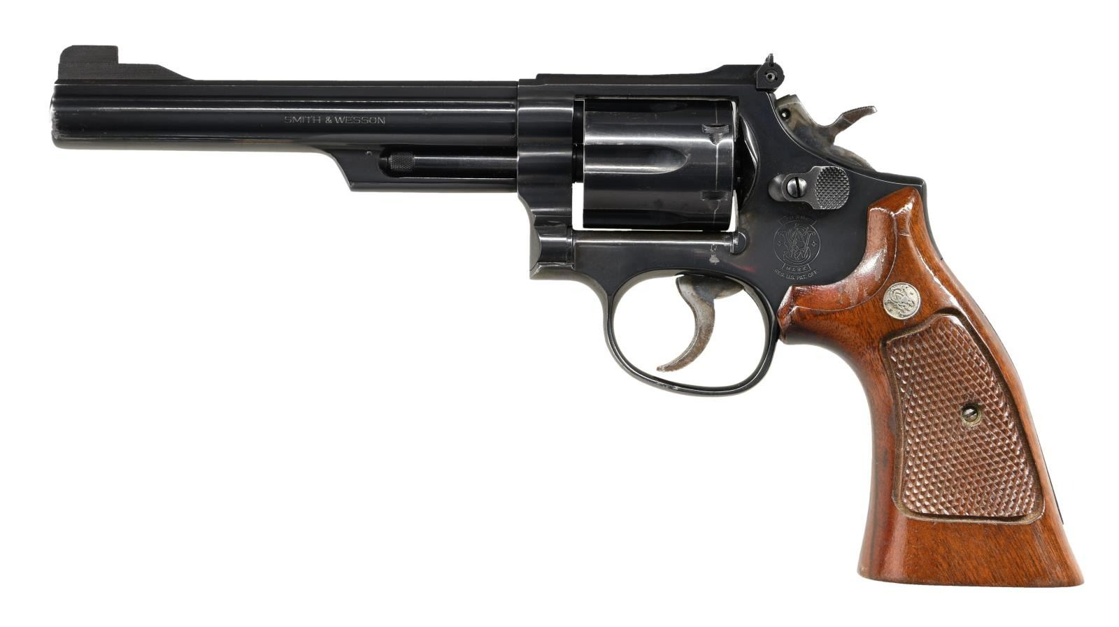 Cal. 357 Mag. S# AJP7517. Bbl. 6". Double action revolver built on the square butt K frame w/ 3 screws. Blued finish. 6 shot fluted cylinder. Patridge front & black Micrometer click adjustable rear sights. .375 checkered semi target hammer. Serrated trigger. S&W logo on left side of frame. Shrouded ejector. 10 groove serrated back strap & frontstrap. Checkered walnut grips w/ S&W medallions. CONDITION: Finish coverage is complete & consistent w/ thinning at muzzle and areas of mechanical intervention. Some small scratches typical of normal use. Drag line on cylinder. Grips in nice condition w/ a few small impressions. Medallions sharp. Bright bore w/ strong rifling. Timing appears to be correct. (23-2339/JZ). MODERN. $400-600.