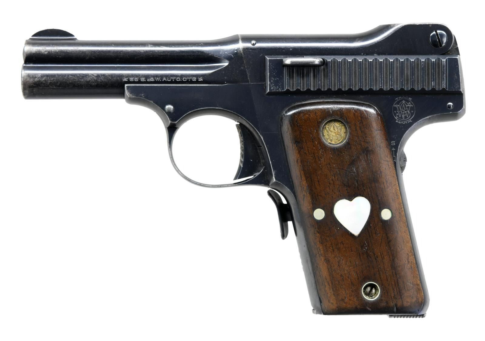 Cal. 35 S&W Auto. S# 4996. Bbl.3.5". Mfg. 1913-1921. Blued, self loading pistol chambered in 35 S&W Auto. Second style magazine release, Serrated grip safety located at the front of the grip, engaged w/ middle finger. Rotating manual safety located at rear of grip, on backstrap. Serrated slide. Round integral front blade & notch rear sights. Left side of barrel marked "35 S&W AUTO CTG". S&W logo on left side of frame above manual safety. Serial number located on front strap. 3 line patent block on top strap, ending w/ patent date Sept. 24, 1912. Smooth hardwood grips w/ S&W medallions at top, embellished w/ Mother of Pearl heart in center. MAGS: 1 steel 7 round. CONDITION: Blued finish complete & consistent w/ some thinning primarily on barrel, at muzzle. Grips posses a few typical impressions retaining gold medallions. Bright bore w/ strong rifling. (23-2441/JZ). CURIO. $400-800.