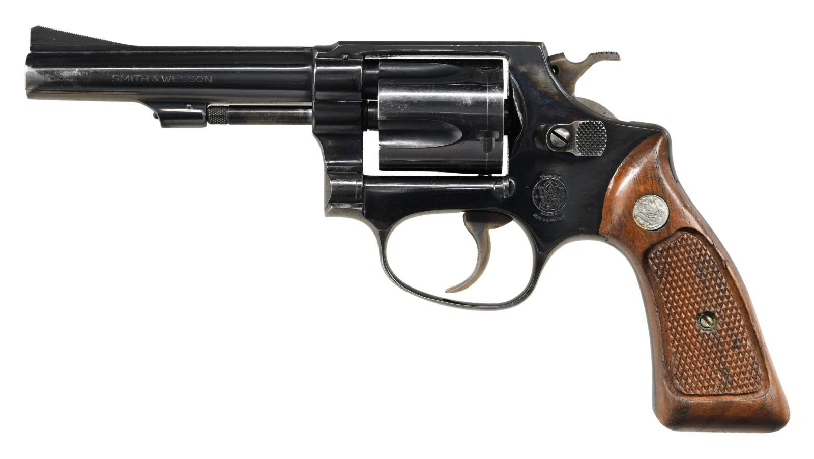 Cal. 38 S&W. S# 119510. Bbl. 4". Mfg. 1957-1961. Blued finish double action revolver built on square butt frame w/ 3 screws. 4" tapered pinned barrel. 5 shot fluted cylinder. Thin serrated ramp front & rear notch sights. Checkered hammer. Serrated trigger. Smooth front strap & backstrap. Small S&W logo on left side of frame. Unshrouded ejector. Barrel marked on left; "SMITH & WESSON" & marked on right: "38 S&W Ctg". Checkered walnut grips w/ S&W medallions. CONDITION: Blued finish retains majority coverage w/ scattered thinning, primarily at muzzle & on cylinder. Grips evidence some staining while retaining sharp medallion on left side. Timing appears to be correct. Bright shiny bore. (23-2351/JZ). CURIO. $350-550.