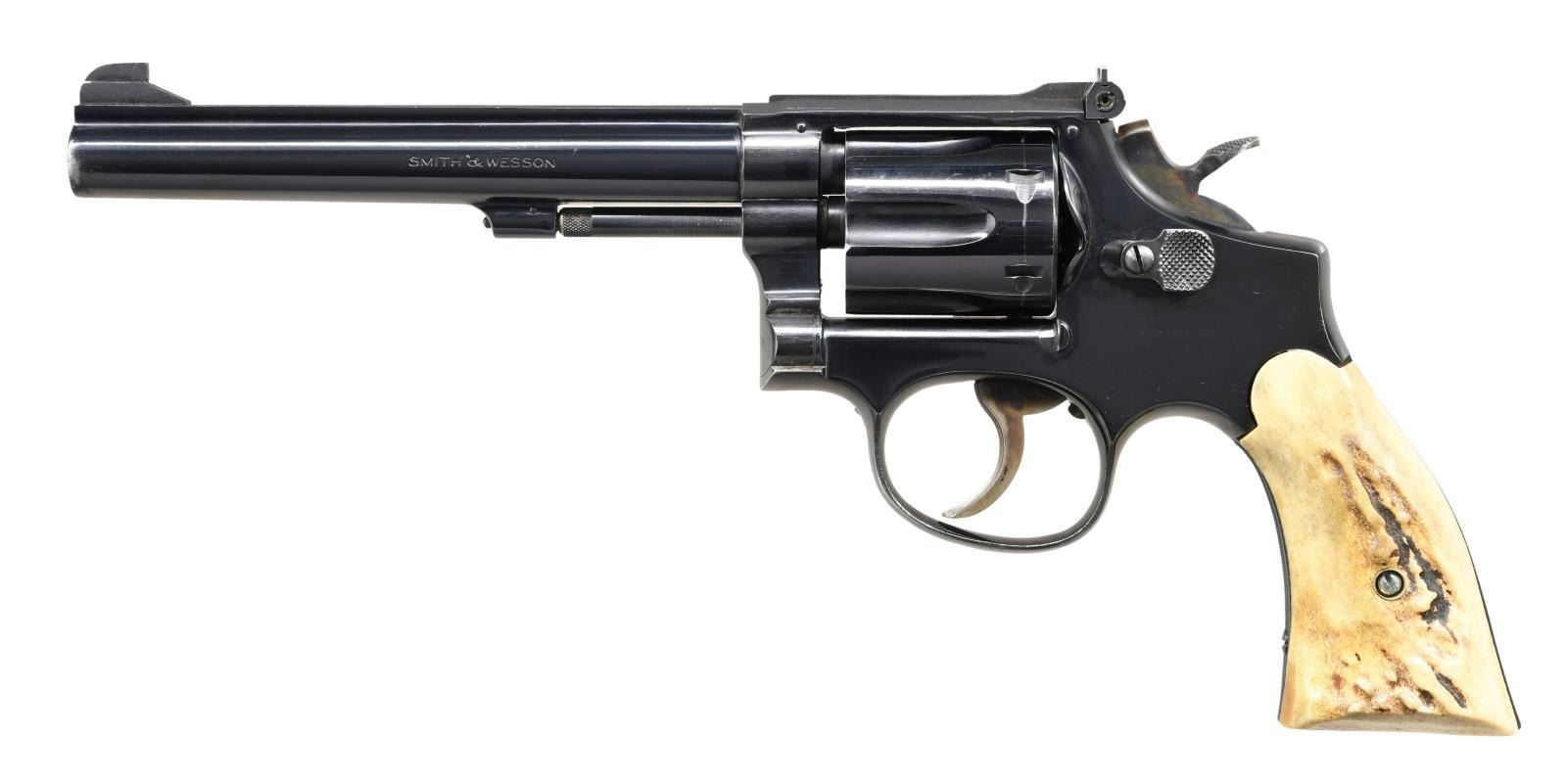 Cal.22LR. S# K33624. Bbl. 6". Mfg. 1958. Double action revolver built on the square butt K frame w/ 4 screws. Blued finish. 6" ribbed & pinned barrel. 6 shot fluted, counterbored cylinder. 1/8" patridge front & white outline micrometer click rear sights. .500 checkered target hammer. Serrated trigger. Large S&W logo on right sideplate. 10 groove fore strap & backstrap. Exposed ejector rod. Bone grips by Pointer Products. CONDITION: Blued finish complete & consistent w/ some thinning on high spots & at muzzle. Drag line on cylinder. Grips in nice condition. Timing appears correct. Bright bore w/ strong rifling. PROVENANCE: From the Collection of James B. Taylor. (23-2248/JZ). CURIO. $350-550.