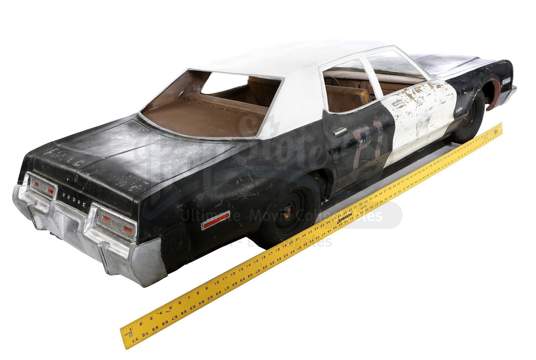 This model miniature features a fibreglass body over a wood-and-metal frame, with four hard foam tyres painted black, a clear plastic windshield, a small side spotlight, and a metal push bumper. The undercarriage of the model is highly detailed as it is seen prominently in the shot. The body of the car is painted to match its full-scale film counterpart, a black-and-white decommissionedpolice cruiser, with a faded star emblem and "P1" label. The Bluesmobile model exhibits some intentional dents, weathering, and painted-on rust effects, as well as general wear from aging, including paint chipping and fading, and scuffing to the foam elements. The wheels, while included in the lot, are not secured to the axles but can be placed on them for display. Dimensions: 193.25 cm x 71.25 cm x 48.26 cm (76" x 28" x 19")