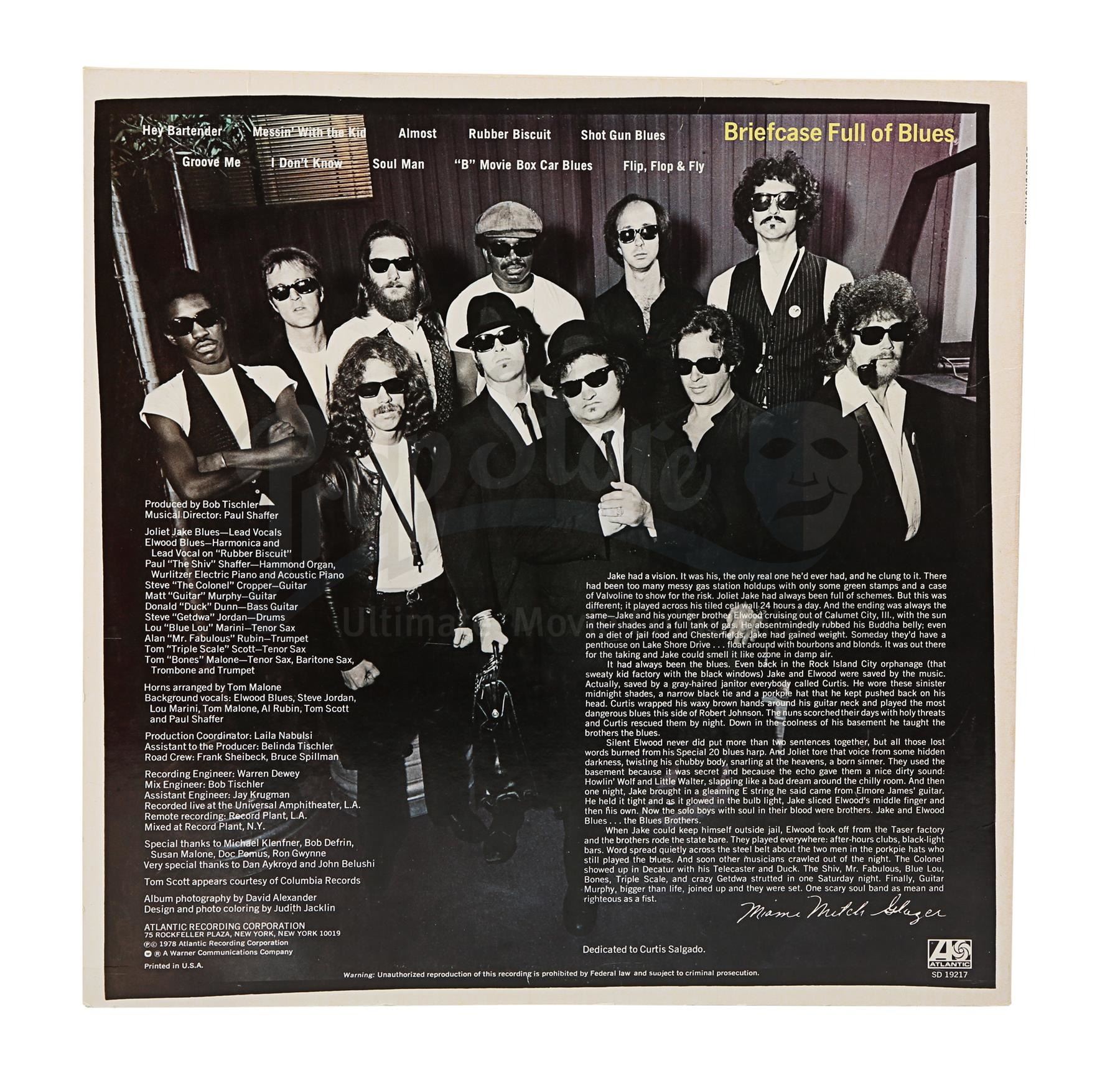 The cover of the 1978 album has been autographed in pen, with individual inscriptions from Landis, Belushi and Aykroyd (who has signed as his character "Elwood"). The reverse of the cover features a track list, a picture of Elwood and €˜Joliet' Jake Blues with their fellow musicians, and a history of the band. The vinyl inside sits in a paper sleeve and can be removed from the right-hand side. The album has some minor wear from age and storage, including some creasing and discolouration. Dimensions: 31 cm x 31 cm x 0.3 cm (12 1/4" x 12 1/4" x 1/8")