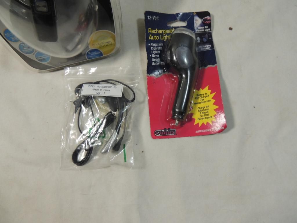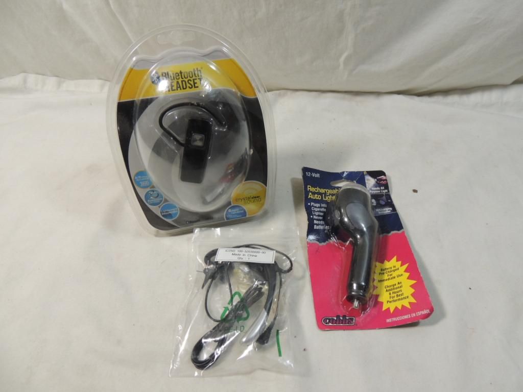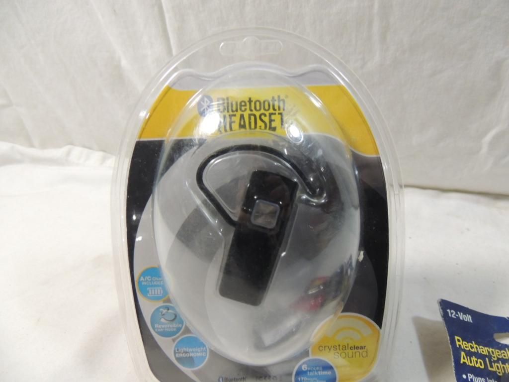 12 VOLT RECHARGEABLE AUTO LIGHT. HEADSET, BLUETOOTH HEADSET AS SHOWN SEE PHOTO FOR MORE DETAILS.