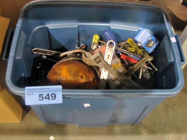 BLue container filled with assorted hand tools