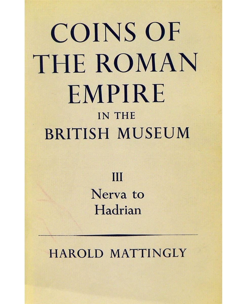 [British Museum]. Mattingly, Harold. COINS OF THE ROMAN EMPIRE IN THE BRITISH MUSEUM. VOLUME III: NERVA TO HADRIAN. London: British Museum, 1966 reprint with revisions. 8vo, original red cloth, gilt; jacket. cxcvi, 640 pages; 102 plates of coins. Fine. Clain-Stefanelli 4017*. Grierson 73. Kroh 72.