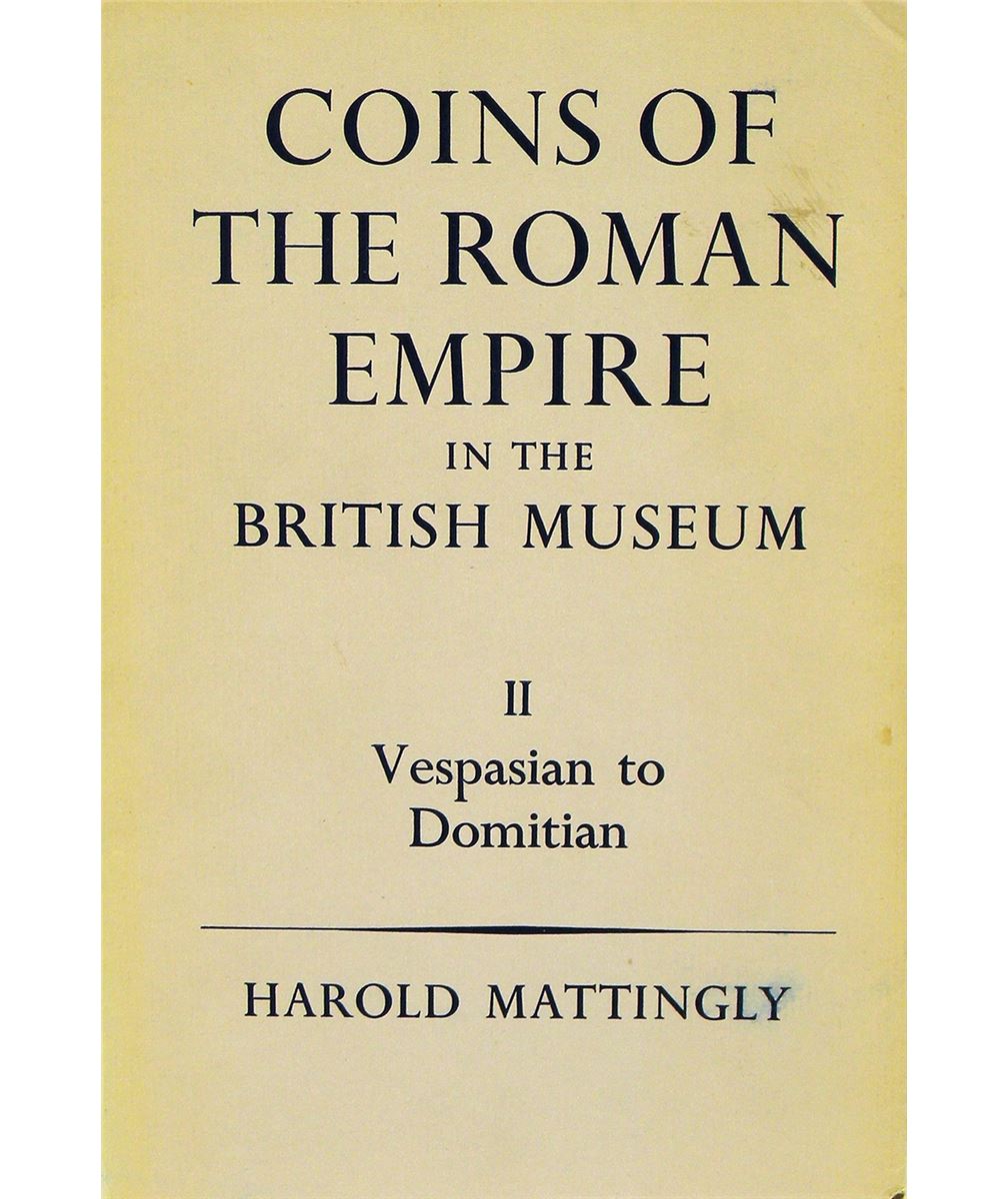 [British Museum]. Mattingly, Harold. COINS OF THE ROMAN EMPIRE IN THE BRITISH MUSEUM. VOLUME II: VESPASIAN TO DOMITIAN. London: British Museum, 1966 reprint. 8vo, original red cloth, gilt; jacket. cv, (3), 485, (1) pages; 83 plates of coins. Near fine. Clain-Stefanelli 4017*. Grierson 73. Kroh 72.