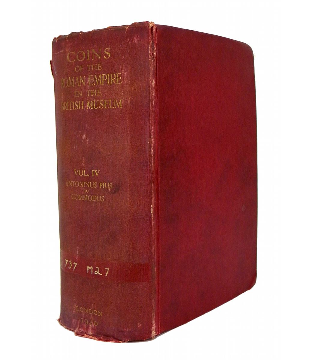 [British Museum]. Mattingly, Harold. COINS OF THE ROMAN EMPIRE IN THE BRITISH MUSEUM. VOLUME IV: ANTONINUS PIUS TO COMMODUS. London: British Museum, 1940. First edition. Thick 8vo, original red cloth, gilt. cc, 964, (6) pages; 111 fine plates of coins. Spine sunned; ex library copy, with spine number and endpaper stamps; very good. The scarce first edition of this massive volume, with superior plates. The library markings are minimal. Clain-Stefanelli 4017*. Grierson 73. Kroh 72.