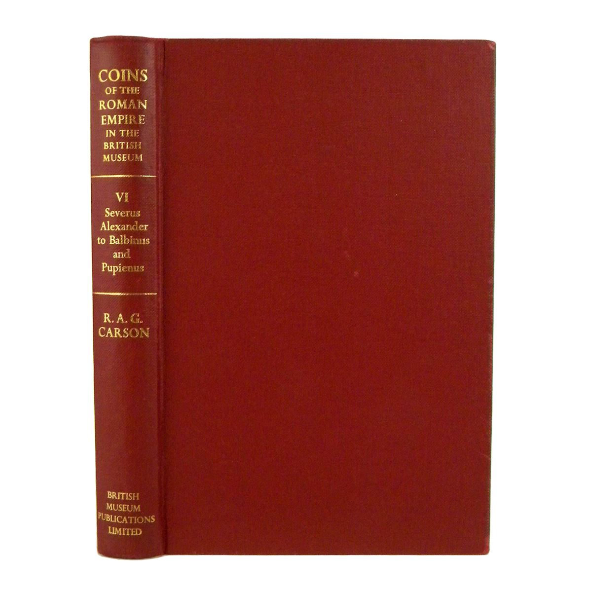 [British Museum]. Carson, R.A.G. COINS OF THE ROMAN EMPIRE IN THE BRITISH MUSEUM. VOLUME VI: SEVERUS ALEXANDER TO BALBINUS AND PUPIENUS. London: British Museum, 1976 reprint. 8vo, original maroon cloth, gilt. viii, (2), 311, (1) pages; 47 plates of coins. Fine. Clain-Stefanelli 4017*. Grierson 73. Kroh 72.