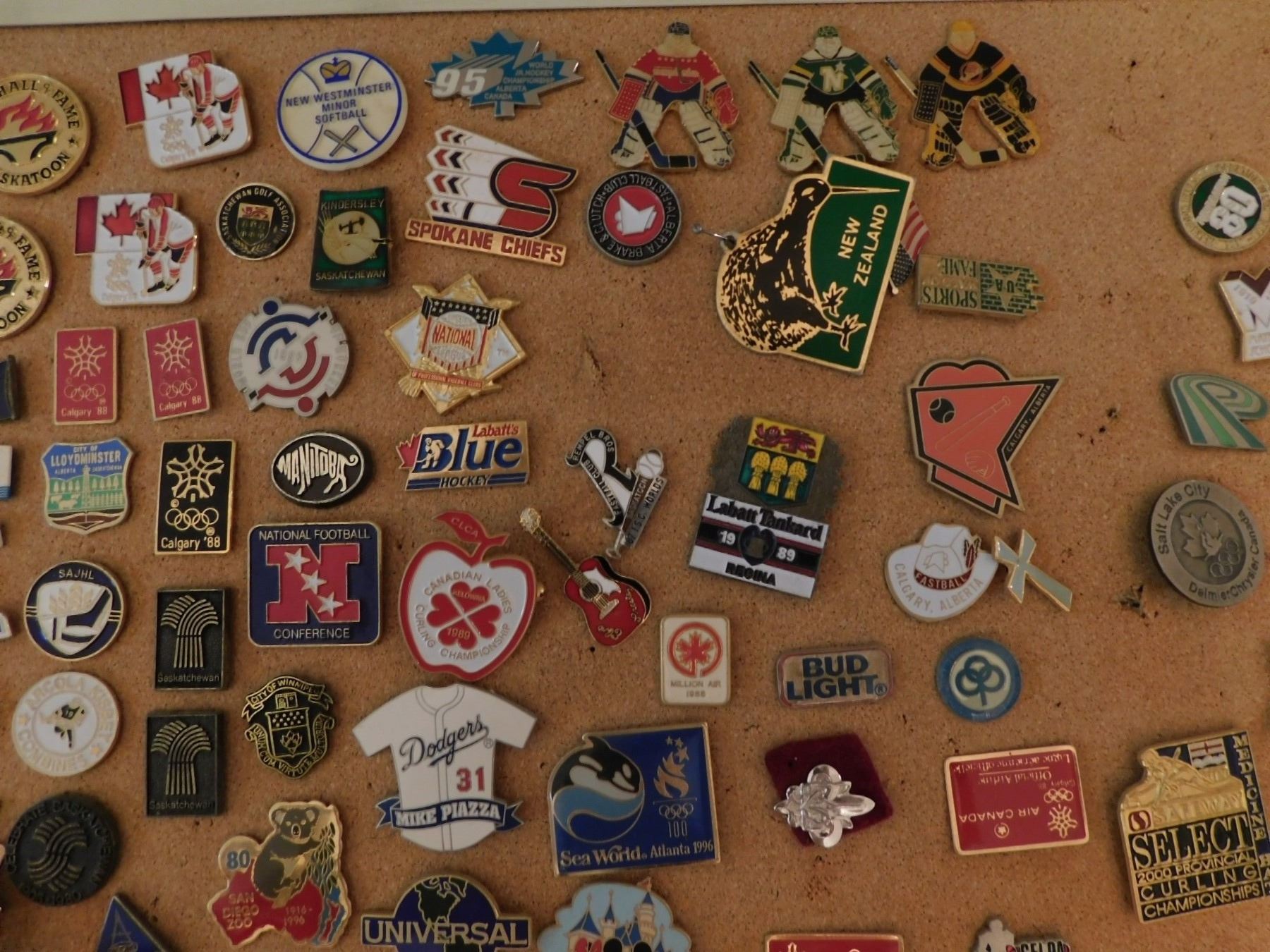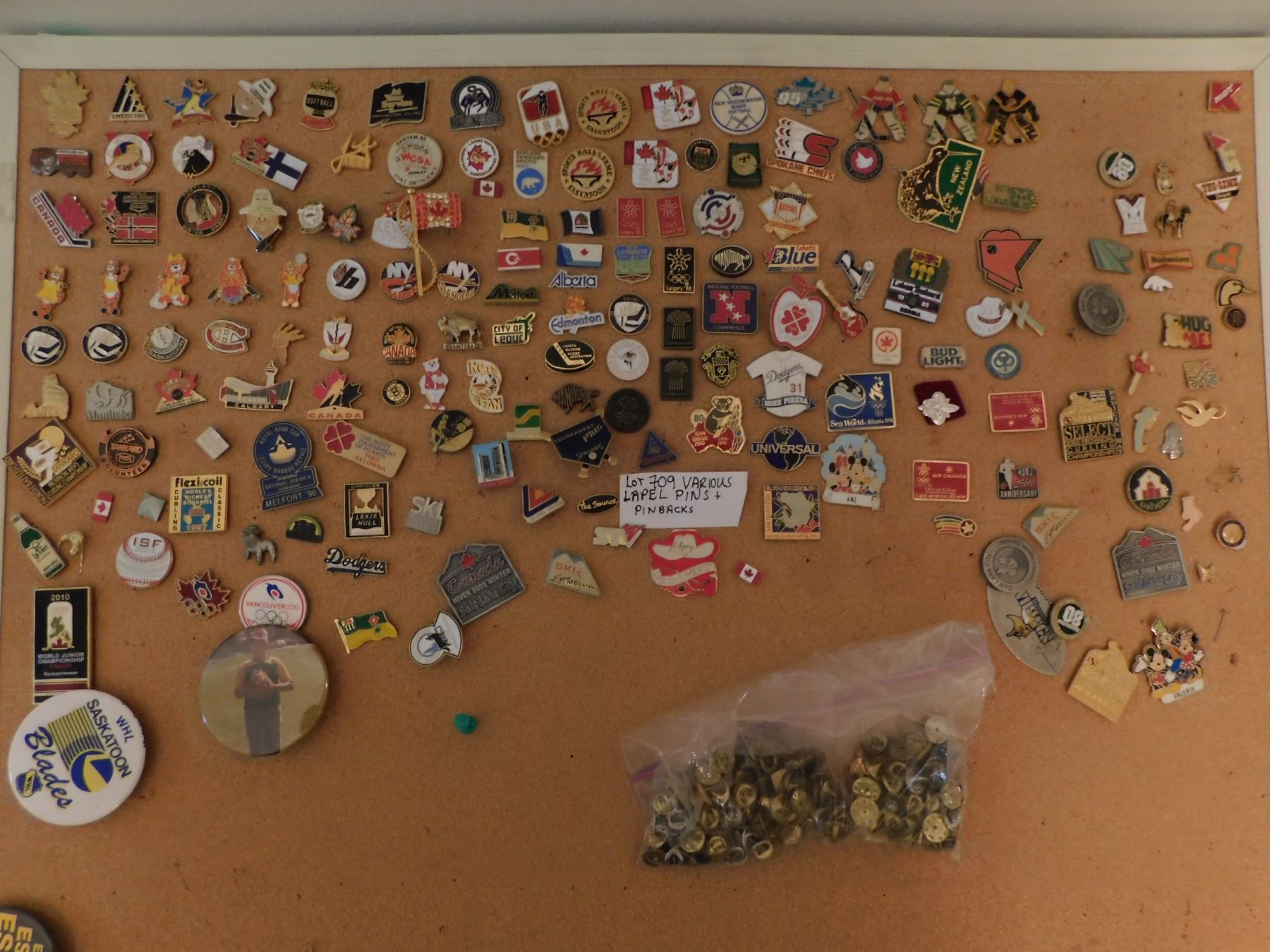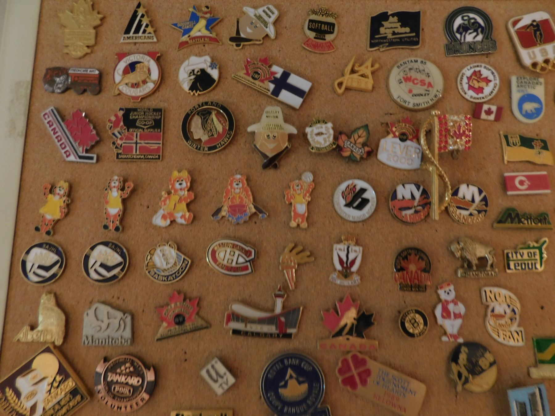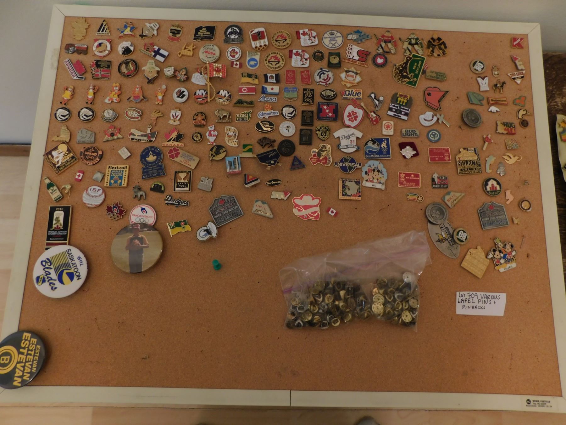 BOARD WITH VARIOUS LAPEL PINS AND PINBACKS