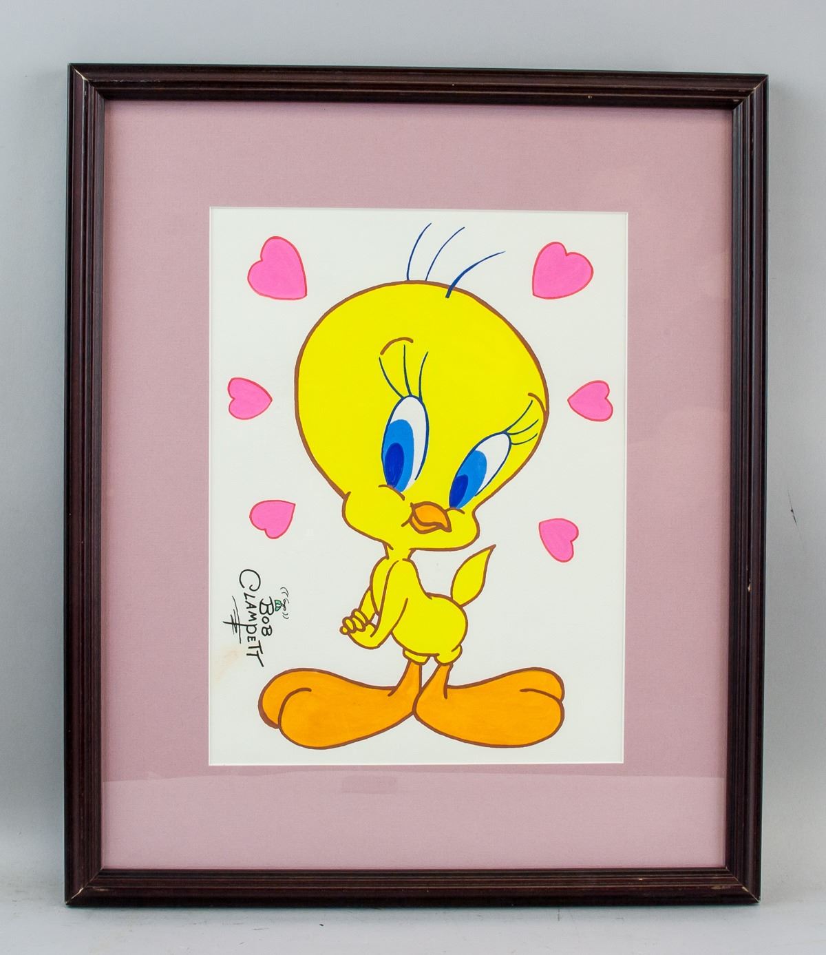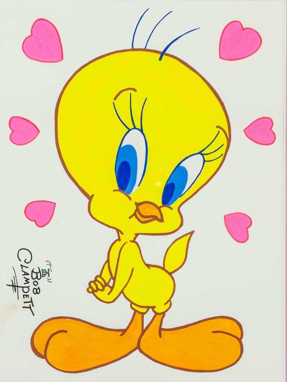 Mixed media on paper, framed. Featuring Tweety Bird from Looney Tunes. Signed and attr. Bob Clampett (American, 1913-1984) on the lower left corner. Picture size: 30 x 22.5 cm (11.8 x 8.9 inches), frame size: 46.5 x 39 cm (18.3 x 15.4 inches). Bob Clampett was an American animator, producer, director, and puppeteer best known for his work on the Looney Tunes animated series from Warner Bros., and the television shows Time for Beany and Beany and Cecil. Clampett was born and raised not far from Hollywood, and early on expressed an interest in animation and puppetry. After leaving high school a few months shy of graduating in 1931, Clampett joined the team at Harman-Ising Productions and began working on the studio's newest short subjects, titled Looney Tunes and Merrie Melodies. PROVENANCE: Southern Ontario estate
