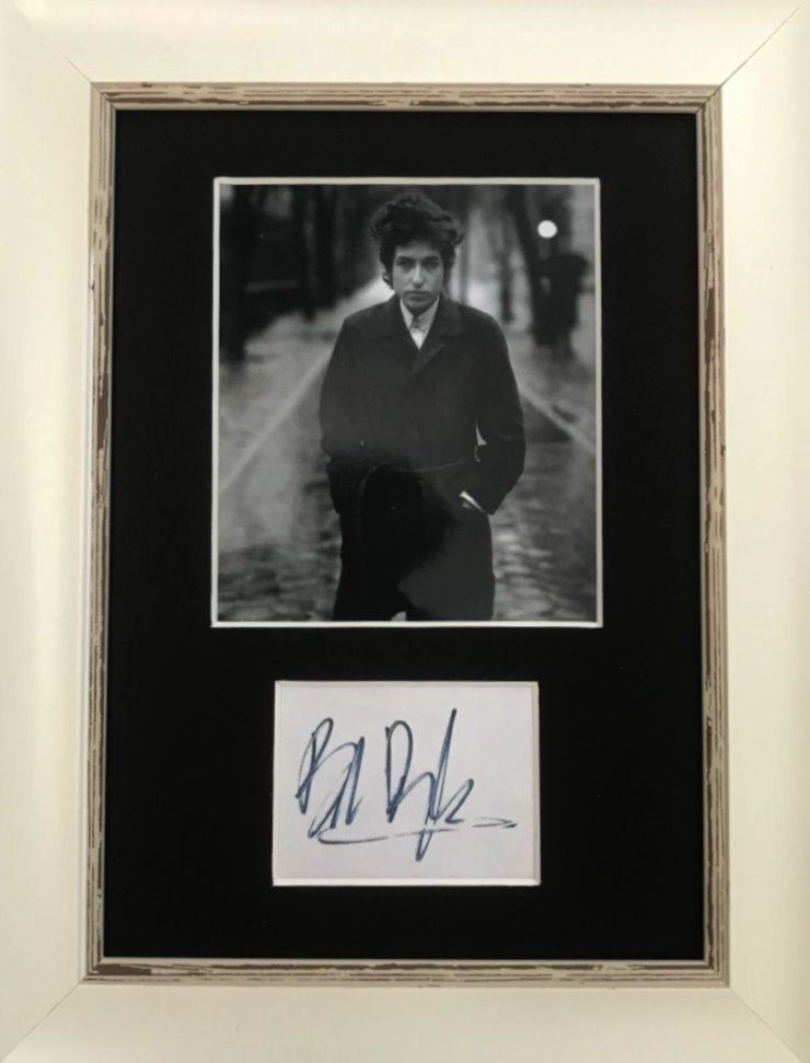 Bob Dylan is an American singer-songwriter, author, and visual artist who has been a major figure in popular culture for six decades. Much of his most celebrated work dates from the 1960s, when songs such as "Blowin' in the Wind" (1963) and "The Times They Are a-Changin'" (1964) became anthems for the Civil Rights Movement and anti-war movement. His lyrics during this period incorporated a wide range of political, social, philosophical, and literary influences, defied pop-music conventions and appealed to the burgeoning counterculture. His autograph is mounted and framed and supplied with coa.