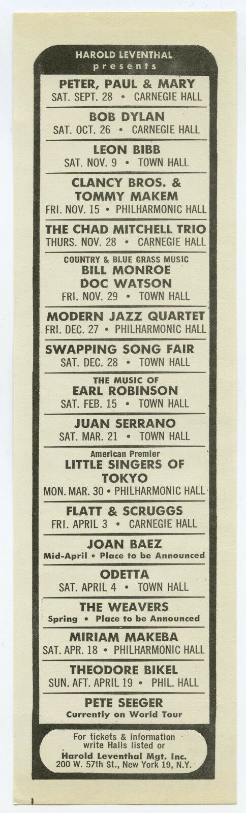 BOB DYLAN / Peter, Paul and Mary/ JOAN BAEZ Original 1963 Carnegie Hall Concert Handbill