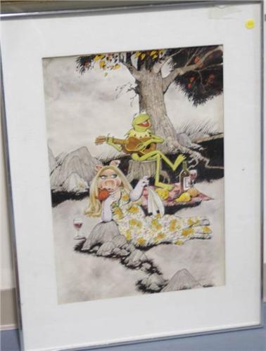 BOB JONES 22"x15" watercolor, Kermit and Miss Piggy, signed lr, condition: small repair to ul corner, SHIPPING: See recommended third party shippers. This item can't be packed or shipped by seller.