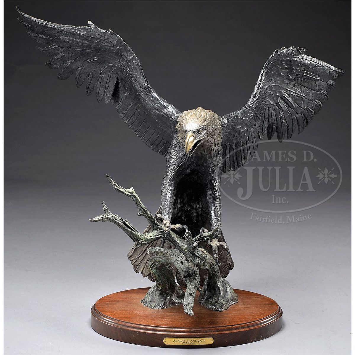Patinated bronze Signed "Bob Parks" and numbered out of an edition of 35 SIZE: Bronze only: 32" h. Total: 35". Wingspan: 41-1/2" w x 35" d. PROVENANCE: Collection and shop contents of Linda and the late Vito Peri (owners of the Blue Dolphin Antique Shop, Northport, Maine). CONDITION: Very good with wonderful multi-colored patina. 9-90067