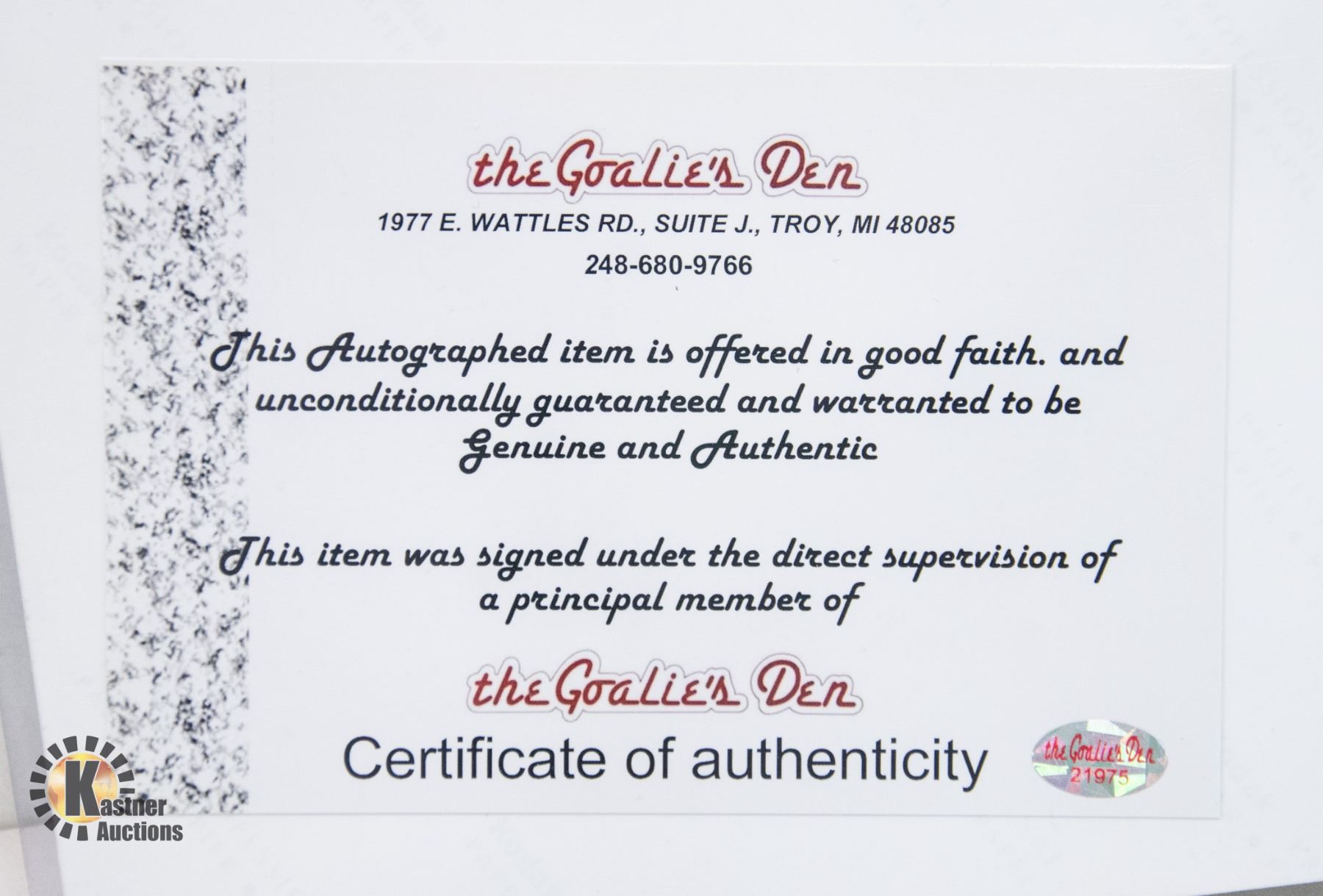 WITH A CERTIFICATE OF AUTHENTICITY, THE GOALIE DEN (#21975) **ALL ITEMS MUST BE REMOVED BY 5PM SATURDAY, OCTOBER 28TH 2023. ALL REMAINING ITEMS WILL BE SUBJECT TO A $6.00 PER DAY STORAGE CHARGE. ANY ITEMS REMAINING AFTER MONDAY, NOVEMBER 13TH, 2023 WILL BE CONSIDERED FORFEITED. NO REFUNDS WILL BE ISSUED FOR FORFEITED ITEMS. TO SCHEDULE A PICK UP APPOINTMENT CLICK HERE