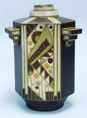 BOCH FRERES, KERAMIS. An unusual Belgian faience vase. The facetted hexagonal sides are handpainted with abstract designs. With three applied stepped handles. Hallmarked and numbered on underside. 12 1/2" high. Circa 1935. 2200-2500