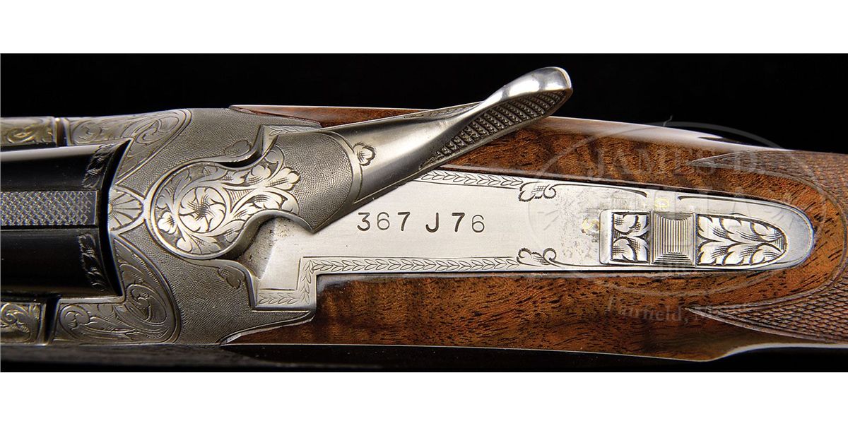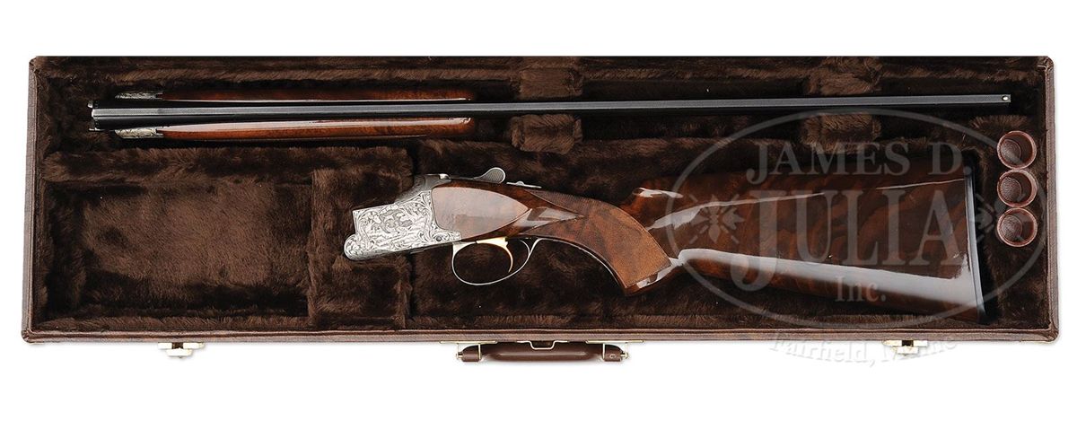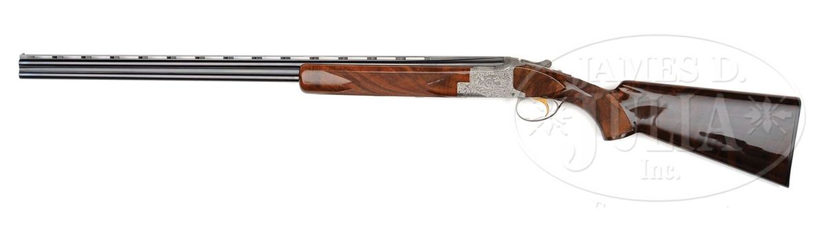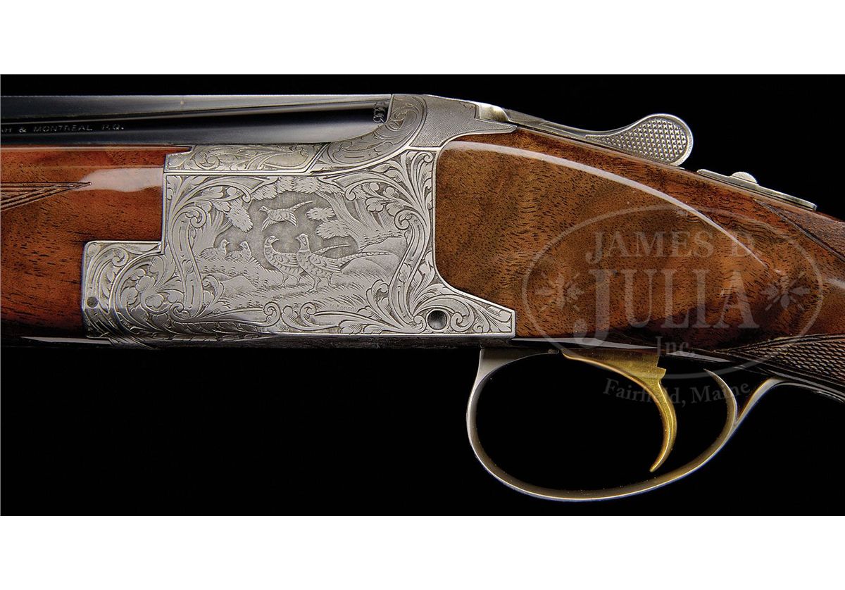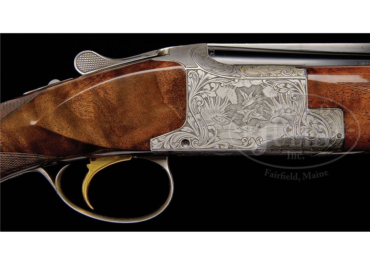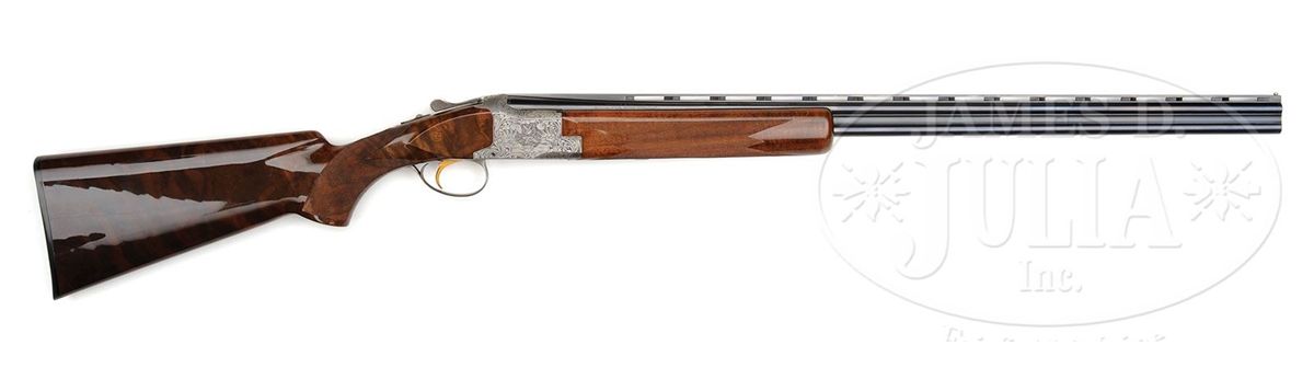 SN 367J76. Cal. .410. 3" Chambers. 28" Bbls with ventilated rib are choked modified and full, and are marked with usual Browning Arms addresses and information on top bbl. Typical gray finished action is engraved with large, scrolled acanthus with stippled background, framing vignettes of five pheasants on left, four ducks in marsh on right, and a pair of quail on bottom of action. A pair of rabbits is on trigger guard bow. Master engraver, M. Bodson's signature is at lower right of pheasant scene. Boldly marbled claro walnut long tang, square knob buttstock measures 14-3/8" over Browning composition buttplate. Modified point pattern checkering is at grip. Rounded field type one piece forend matches buttstock well. Drop at heel: 2-3/16", drop at comb: 1-1/4". Weight: 6 lbs. 12 oz. LOP: 14-3/8". Dark brown vinyl case is lined in brown faux fur and contains orig guarantee and the key. CONDITION: Excellent, essentially as new, appears unfired except for proof, with only the slightest hint of assembly mark on bottom bbl, and some light rubs and a couple of marks in gloss finish of stock. Mechanically crisp. Case is excellent. Interior has some slight compressions. 4-49169 MGM255