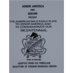 1970 Honor America and Boehm Present The America Bald Eagle Plate to Honor America and to Commemorate our Bicentennial, Limited Issue of 12,000. Made in England, Original Satin Lined Leather case, Plate measures 10½ "D.