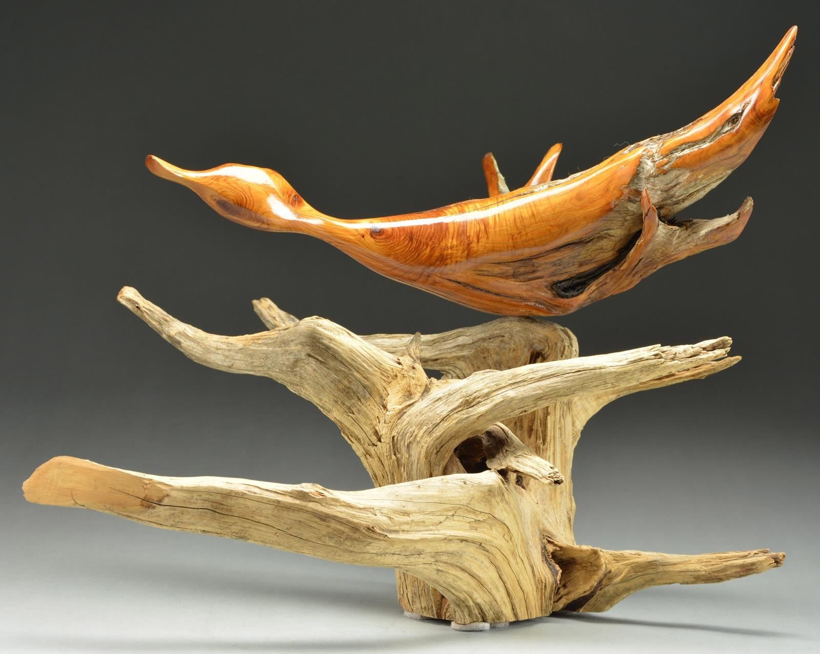 Two piece carving including top section w/ varnished duck head & partial body emanating from juncture of natural root. Carving is mounted on weathered root base. Bottom of duck's breast is marked "BRENT FREED 2014".CONDITION: good. (02-18127/MGM). $50-100.