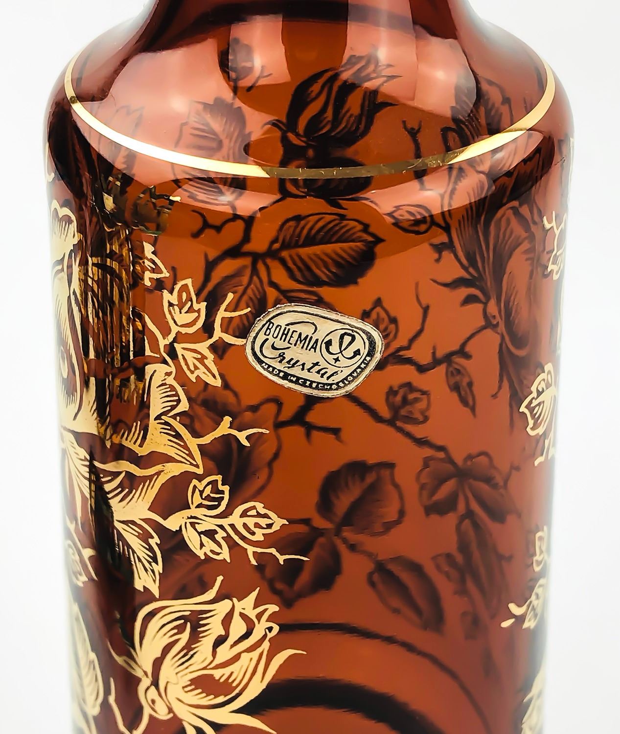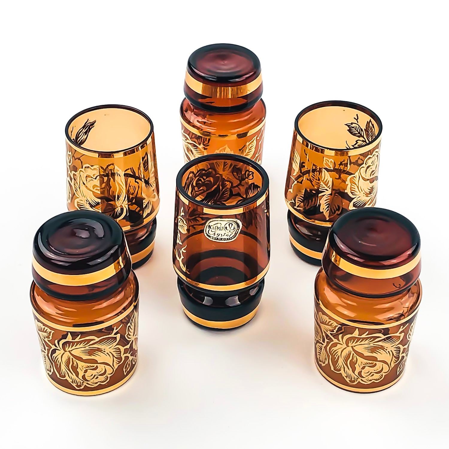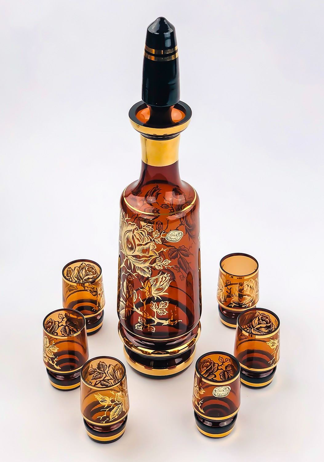 #9059 - AMBER CRYSTAL DECANTER AND 6 GLASSES - MADE IN CZECHOSLOVAKIA, ORIGINAL BOHEMIA CRYSTAL LABELS, DECANTER MEASURES 13.25” (34 CM) TALL WITH STOPPER - 10.25” (26 CM) WITHOUT STOPPER, 3” (8 CM) WIDEST DIA. GLASSES MEASURE 2.5” (6.5 CM) TALL - 1.***ITEM(S) LOCATED IN LETHBRIDGE ALBERTA. ALL ITEMS IN THIS AUCTION QUALIFY FOR OUR FREE TRANSPORT TO EDMONTON SERVICE. WORLDWIDE SHIPPING AVAILABLE