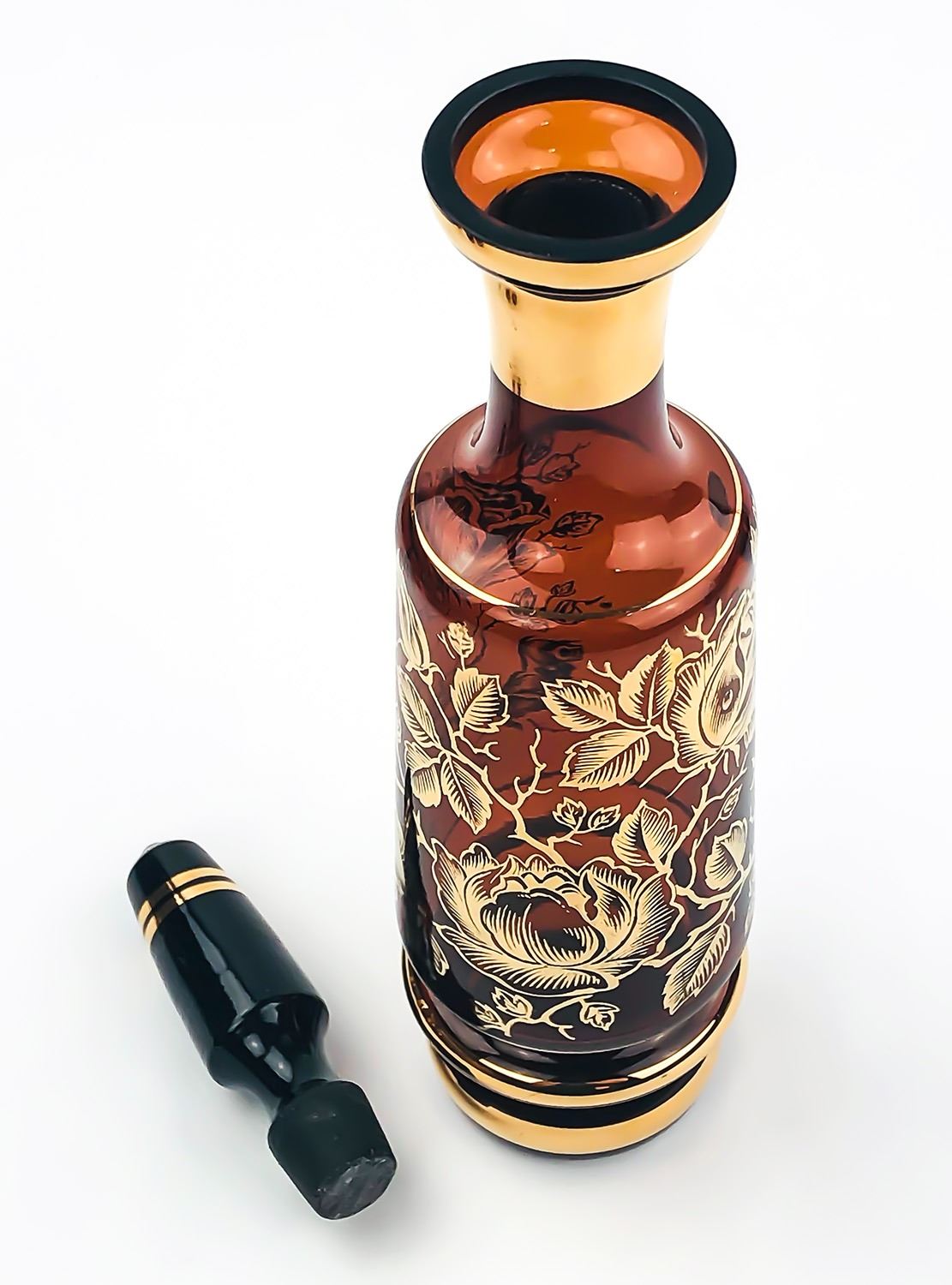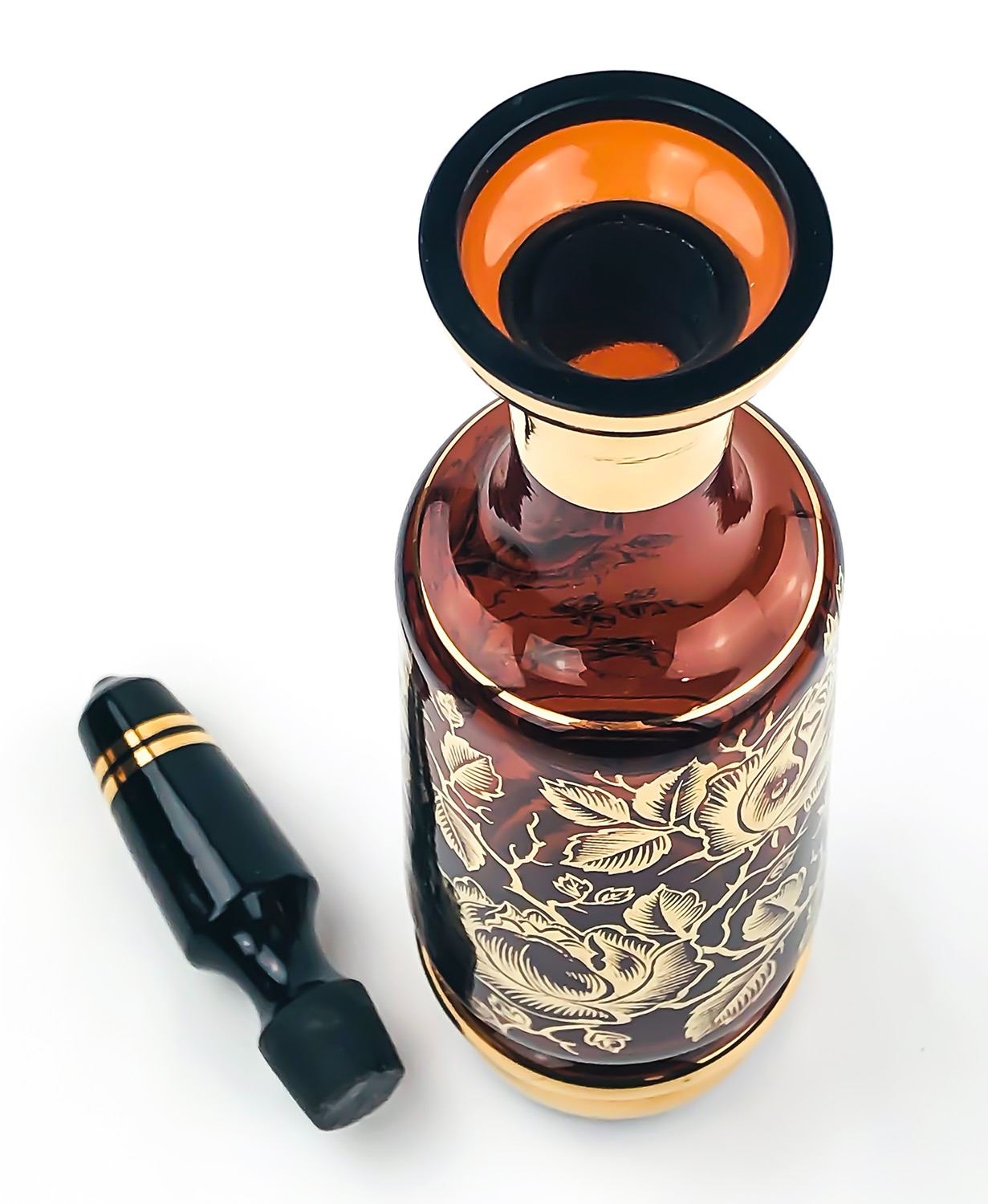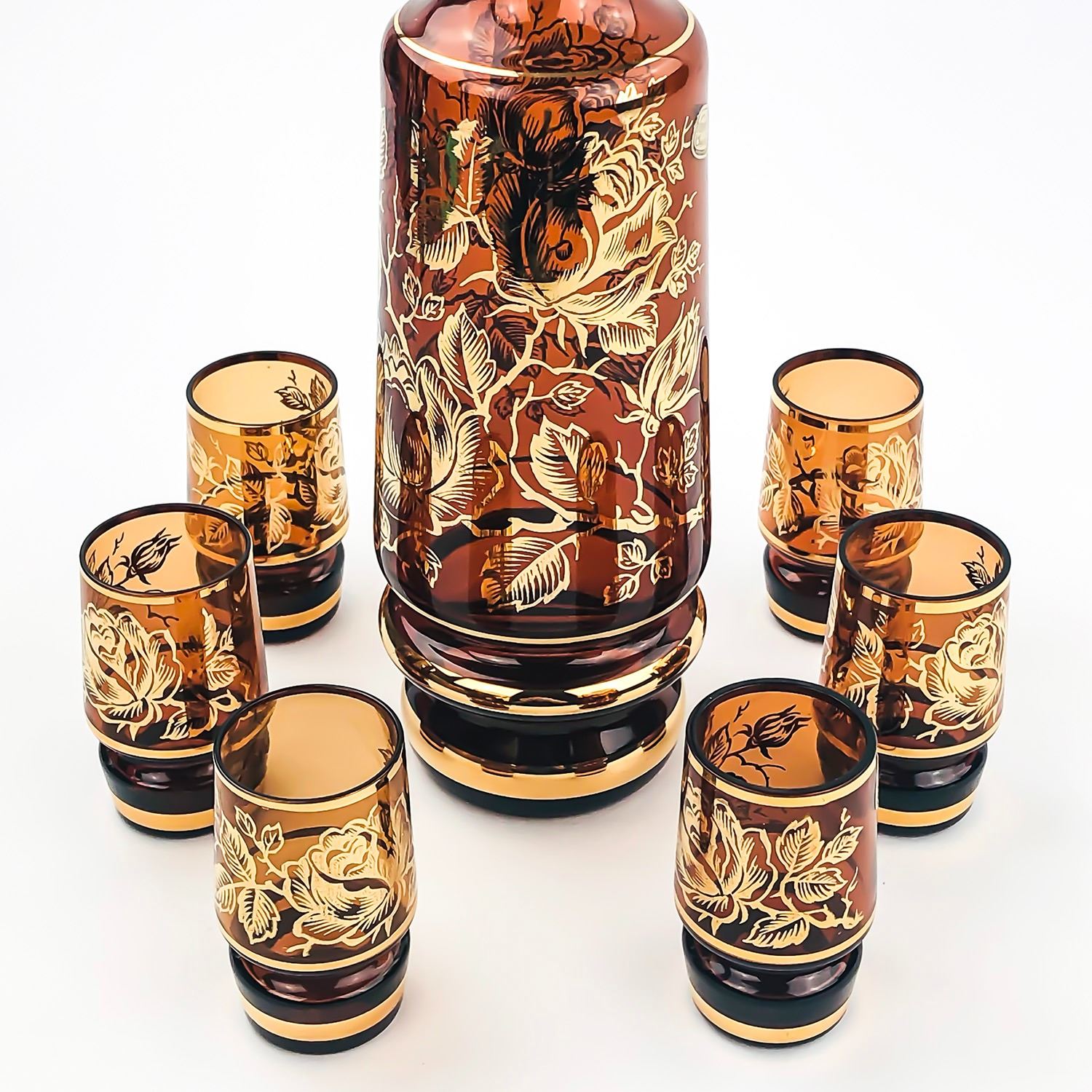 #9059 - AMBER CRYSTAL DECANTER AND 6 GLASSES - MADE IN CZECHOSLOVAKIA, ORIGINAL BOHEMIA CRYSTAL LABELS, DECANTER MEASURES 13.25” (34 CM) TALL WITH STOPPER - 10.25” (26 CM) WITHOUT STOPPER, 3” (8 CM) WIDEST DIA. GLASSES MEASURE 2.5” (6.5 CM) TALL - 1.***ITEM(S) LOCATED IN LETHBRIDGE ALBERTA. ALL ITEMS IN THIS AUCTION QUALIFY FOR OUR FREE TRANSPORT TO EDMONTON SERVICE. WORLDWIDE SHIPPING AVAILABLE