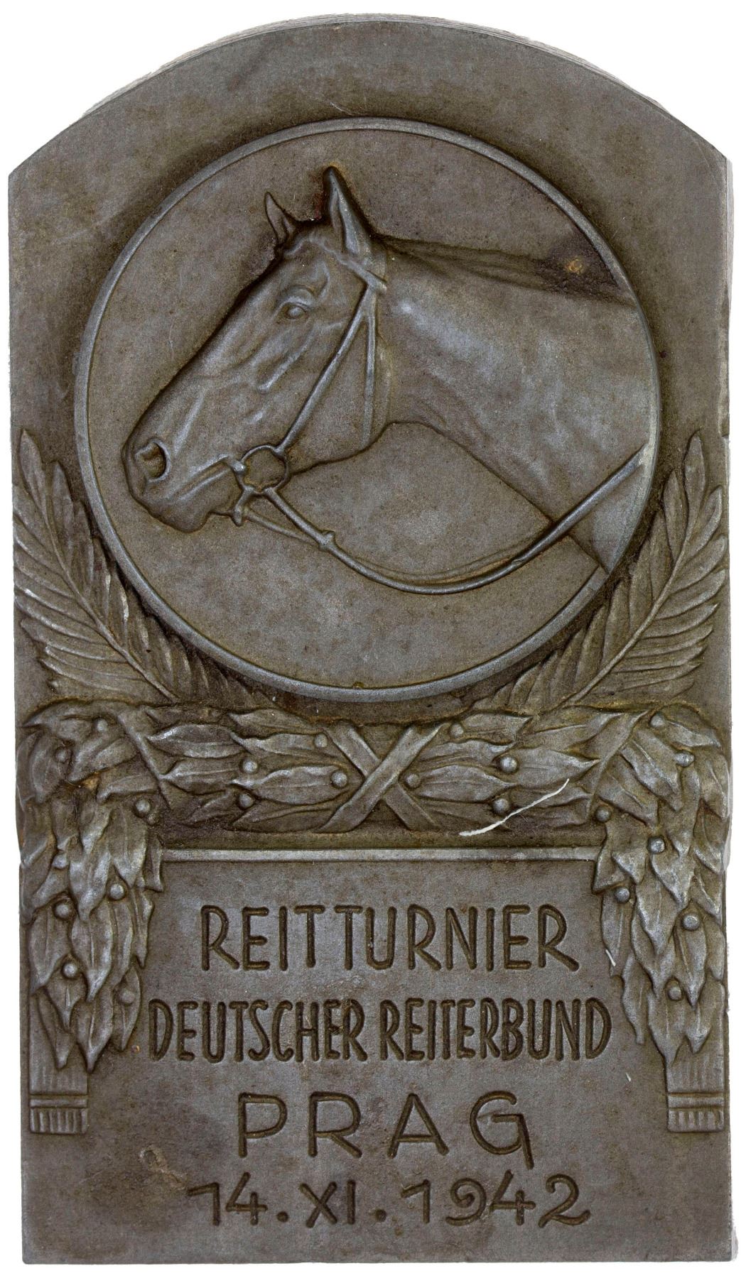 BOHEMIA & MORAVIA: Protectorate, zinc plaque (100.82g), 1942, 44x76mm iron plaque for the German Equestrian Federation - Equestrian Tournament in Prague; REITTURNIER / DEUTSCHER REITERBUND / PRAG / 14 XI 1942, with horse head above in circle, wreath around, uniface, XF. A rare plaque issued during the German Occupation of Czechoslovakia during WWII.