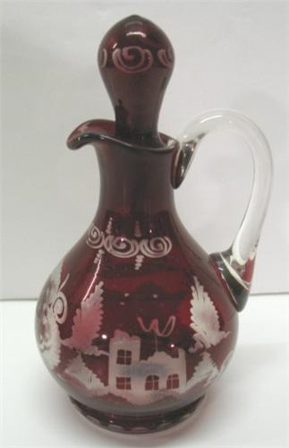 BOHEMIAN GLASS VINEGAR CRUET. Ruby cut to clear glass castle and stag decoration around body. Applied clear glass handle. Ruby cut to clear glass bulbous form stopper. 5.75” H