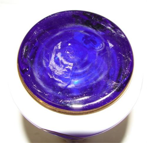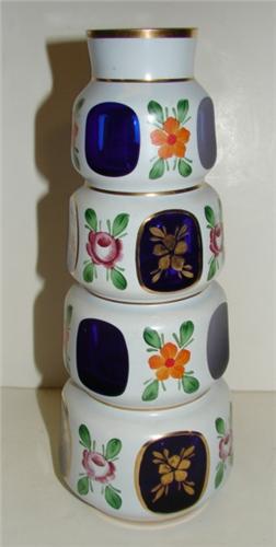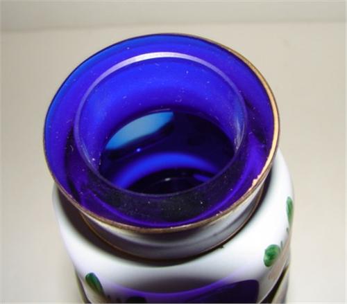 BOHEMIAN GLASS VASE. White cut to cobalt blue glass. Hand painted floral decoration with gilt bands. Excellent condition. 8.75” H