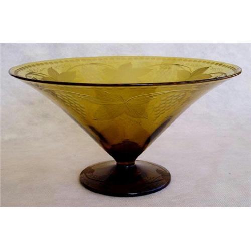 Beautiful topaz color glass bowl, hand blown, engraved with foliage and grapes design, with ground pontil on the base. Foot base is also engraved with same decor. Unusual shape, great condition, no chips, cracks or repairs. Made by one of North Bohemian glass houses, most likely by Egermann in Novy Bor. Dimensions : 10 inches in diameter, 5-1/4 inches high, Czechoslovakia circa 1920's.
