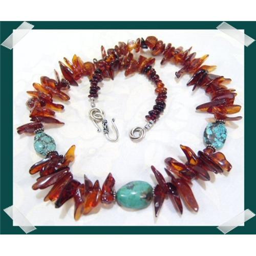Screams originality and one of a kind piece of jewelry Vera has created. GENUINE Cognac spikes of BALTIC amber complimented with genuine turquoise and of course finished to perfection with sterling silver accents. The spikes measure up to 22mm...the perfect size for the turquoise nuggets. The necklace has a length of 19" and a gram weight of 39.