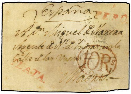 (1800 CA.) Envuelta circulada a MADRID. Marca lineal PLATA y PERU ambas en rojo. Carta humedecida y fragil. MUY RARA.