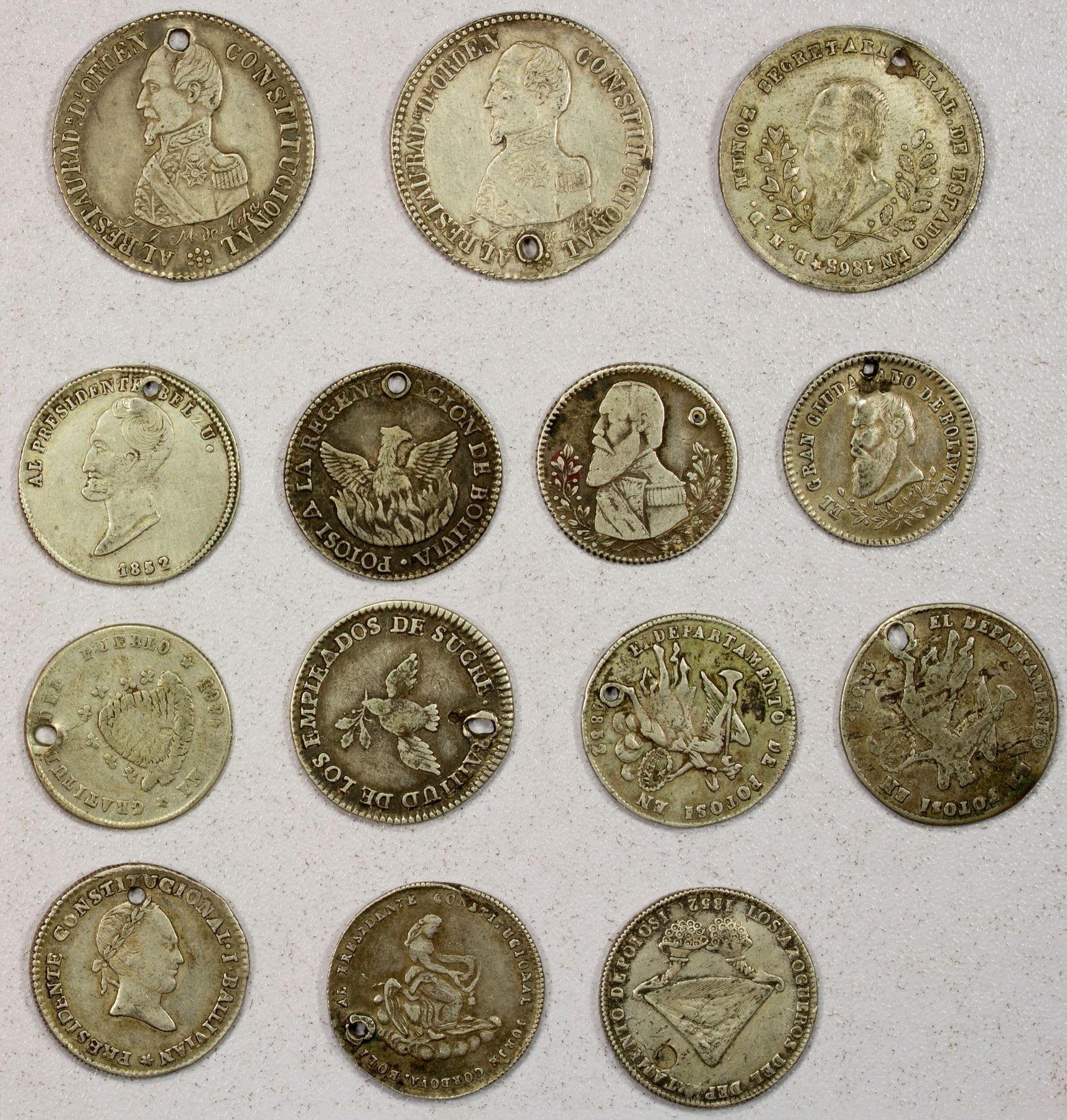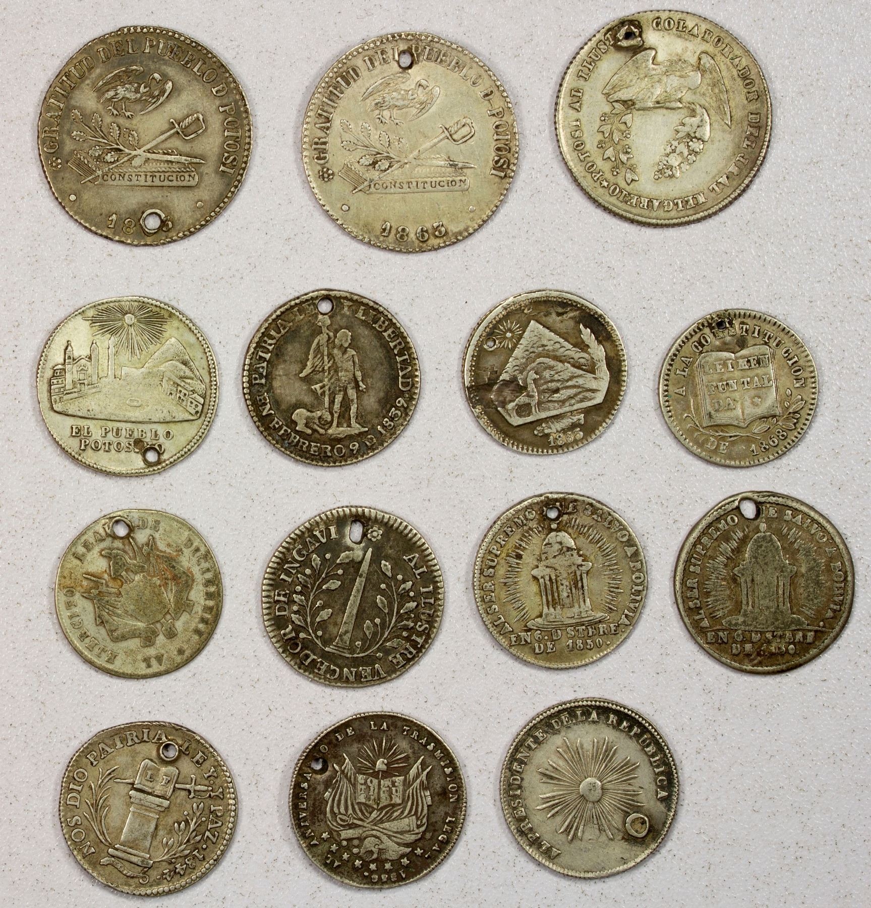 BOLIVIA: LOT of 14 AR monetary medals, all in silver, from various dates between 1839 and 1865, commemorating various events and featuring a variety of designs and presidents, including RTB-84, 103, 111, 139, 141, 149, 156, 211, two of 237, 242, 258, 278, 365; various conditions between VG-F to VF-EF, all holed; retail value $300, lot of 14 pieces.