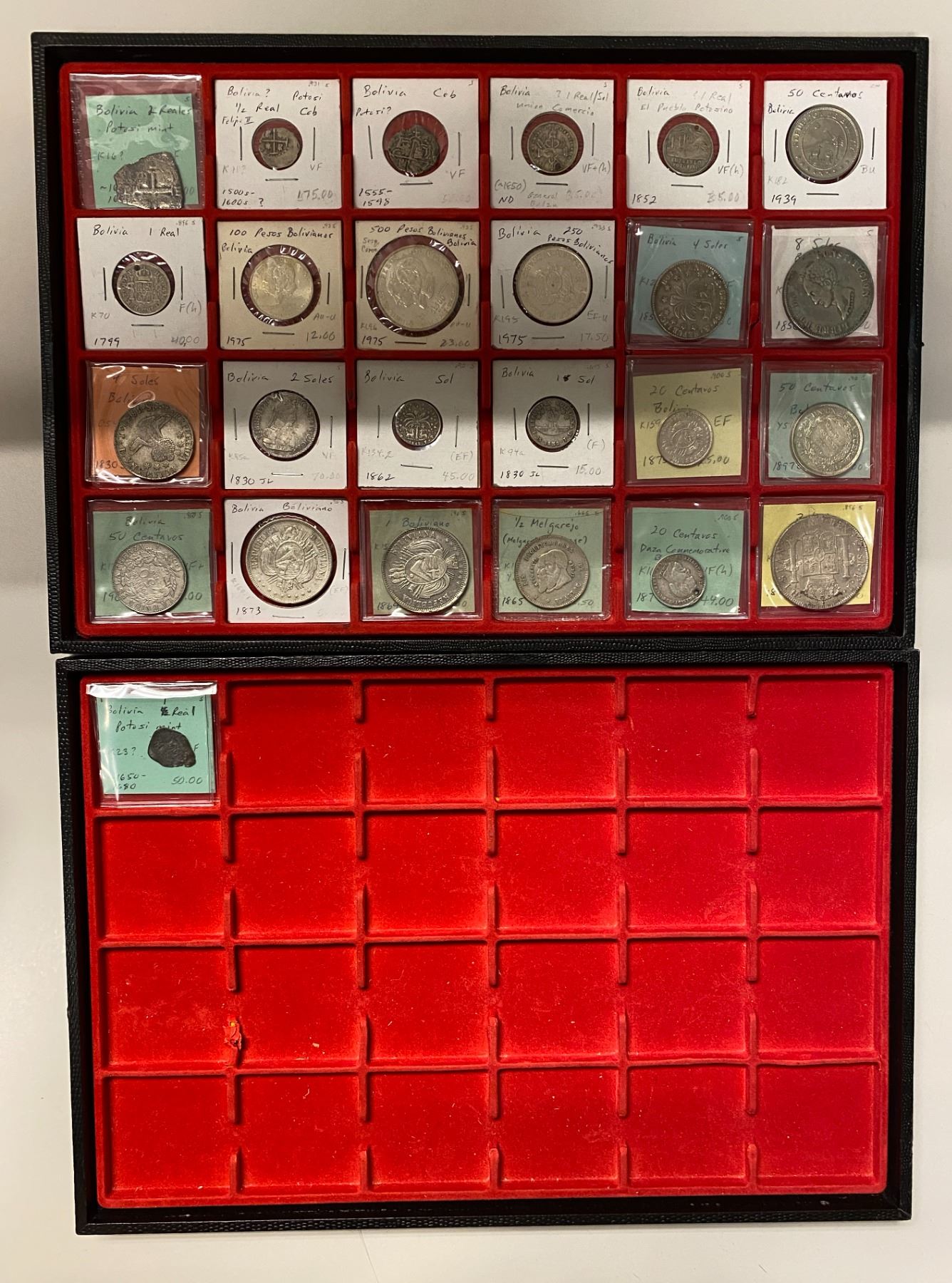 BOLIVIA: LOT of 25 coins, including 4 cobs (in rough shape, one is sea salvage), 2 1-real size holed proclamation coins, an 1814 8-reales (cleaned EF), 6 silver coins of the early republic (1830-1862), 7 silver coins of the later republic (1865-1900), the 3 coin 150th Anniversary of Independence set and 2 others; retail value $750, lot of 25 pieces.