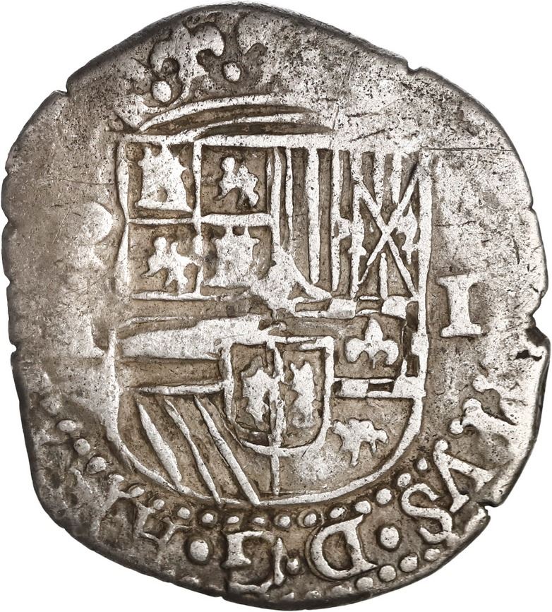 BOLIVIA, Potosí, cob 1 real, Philip II, assayer A. S-P11; KM-2.2; Cal-244. 3.29 grams. VF with sharp full shield, assayer a bit weak but certain, end of king's name and title in legend, nice full cross, dull gray toning with light reddish sedimentation in the fields.
