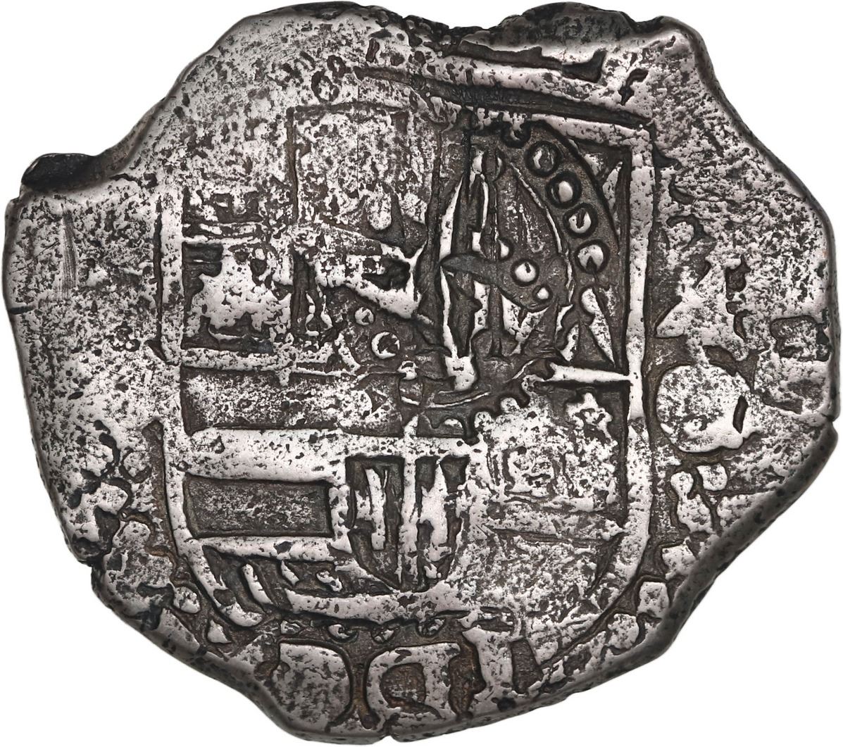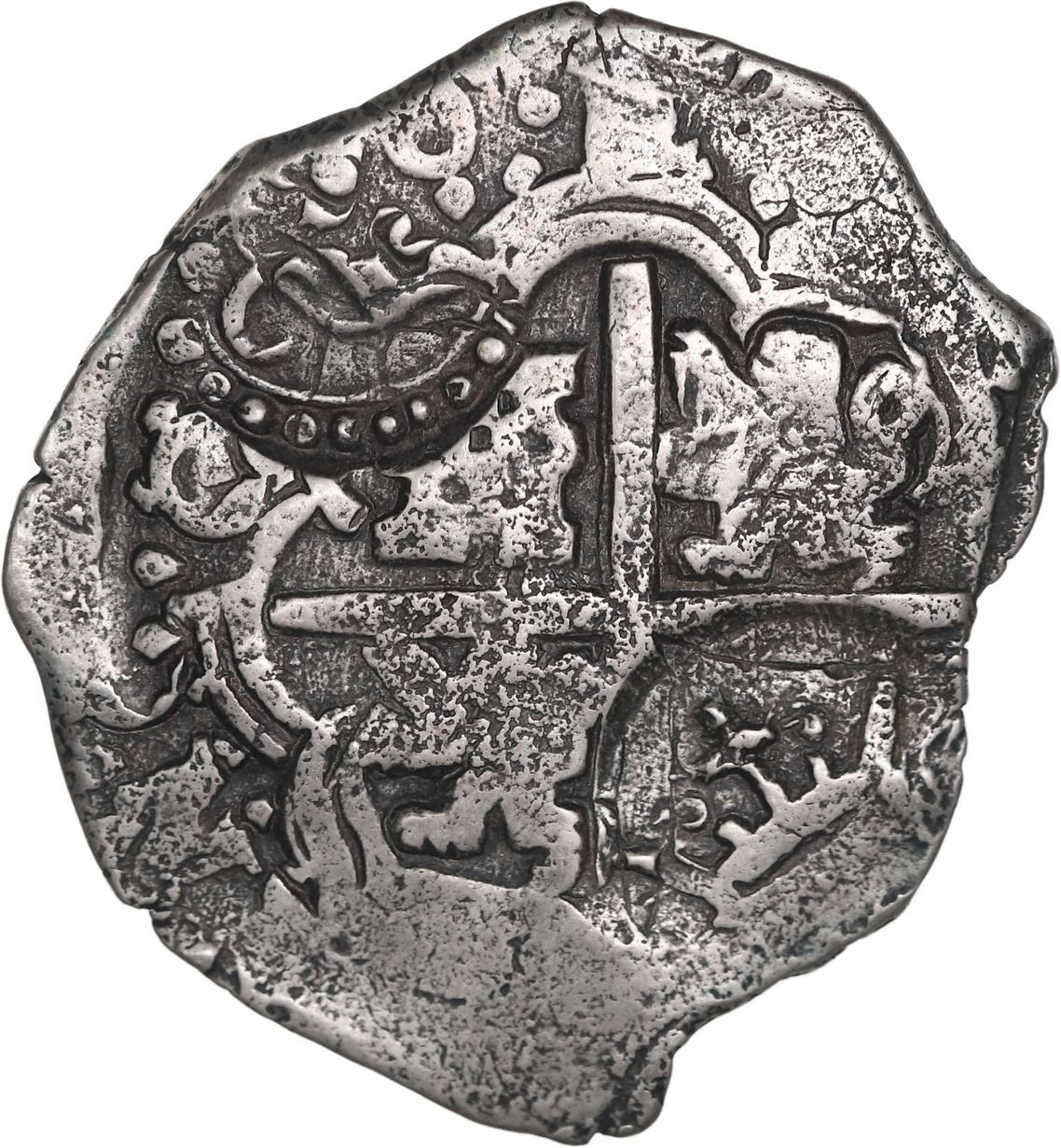 BOLIVIA, Potosí, cob 4 reales, 1650 O, with crowned-A countermark on shield, crowned-C and crown-alone (rare variety) on cross (extremely rare with three countermarks), ex-Ponte, ex-Hudson, ex-Ponterio, Mastalir Plate, KM Plate. S-P35; KM-17b; Cal-1106. 11.79 grams. Odd-shaped flan with only minimal surface pitting, nearly full but hard-to-read countermark with distinctive columns of dots on top of full shield, both countermarks on full cross clear and bold, full 0 of date in legend, toned in crevices, an important and well-pedigreed coin that is one of only two examples of three-countermark 4 reales we have ever handled (for the other, see lot 230 in this auction). Pedigreed to the Luis R. Ponte Collection and the Louis Hudson Collection (Sedwick Auction 6, lot 351), also pedigreed to the Ponterio "La Capitana" auction of April 1999 (lot 41), plated on pages 52, 77, and 378 and of Mastalir's book The Great Transition at the Potosí Mint, 1649-1652: The 1649-1652 Crowned Shield Coinage and the Countermarks of 1652, Part B: The Countermarks of 1652 (2020), also plated in KM's Standard Catalog references. Recovered from: Capitana, sunk in 1654 off Chanduy, Ecuador