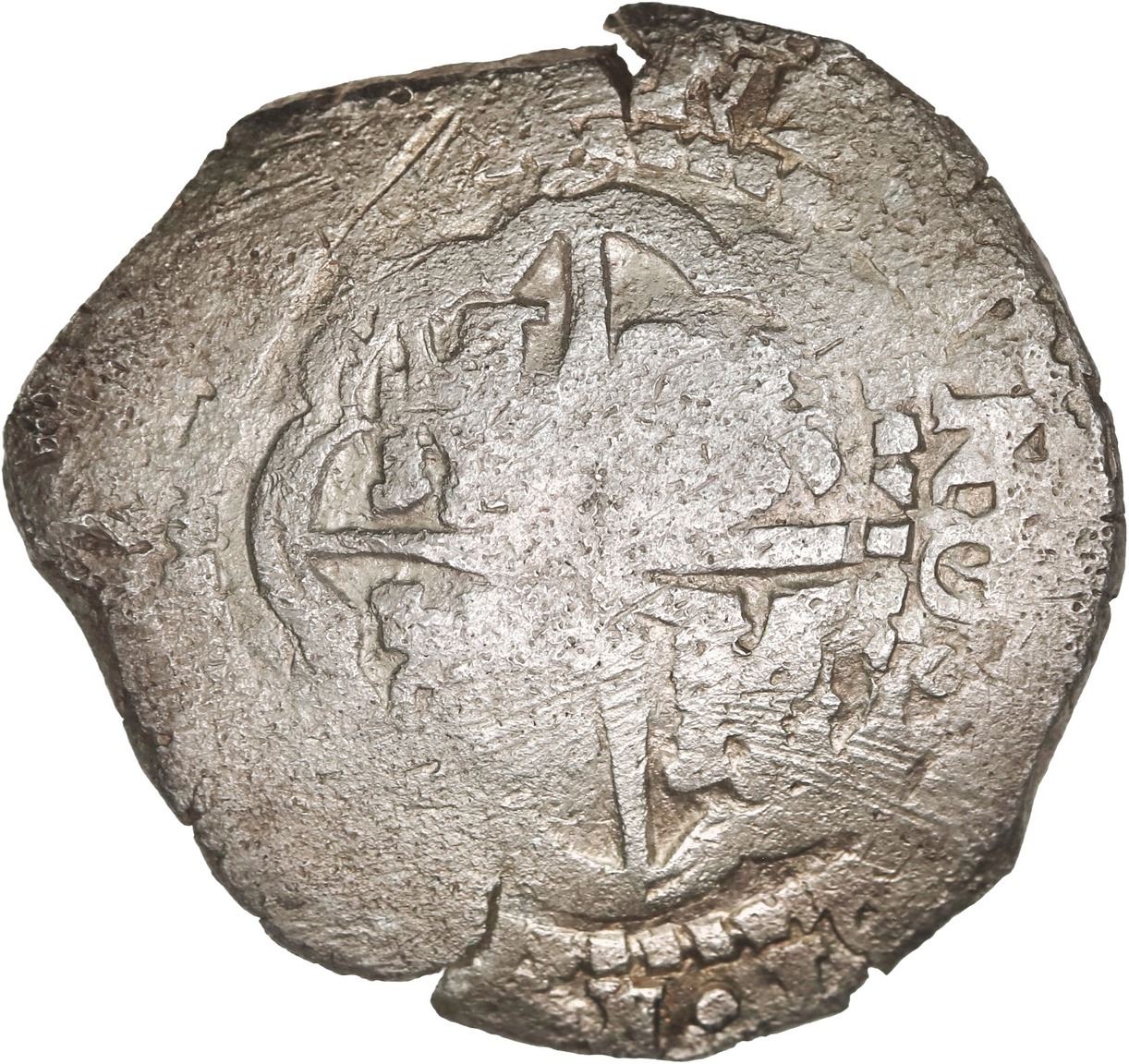 BOLIVIA, Potosí, cob 4 reales, 1651 (modern 5) E, with crowned-PH countermark on shield, ex-Ponte, Mastalir Plate. S-P36; KM-17b; Cal-1108. 12.72 grams. Low contrast due to light corrosion and no toning, the countermark (which warped the flan a bit) nevertheless clear with its distinctive crown (full), bottom half of 51 of date. Pedigreed to the Luis R. Ponte Collection and plated on page 362 of Mastalir's book The Great Transition at the Potosí Mint, 1649-1652: The 1649-1652 Crowned Shield Coinage and the Countermarks of 1652, Part B: The Countermarks of 1652 (2020). Recovered from: Capitana, sunk in 1654 off Chanduy, Ecuador