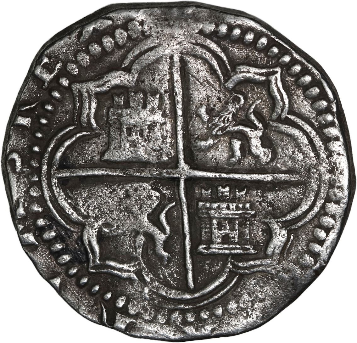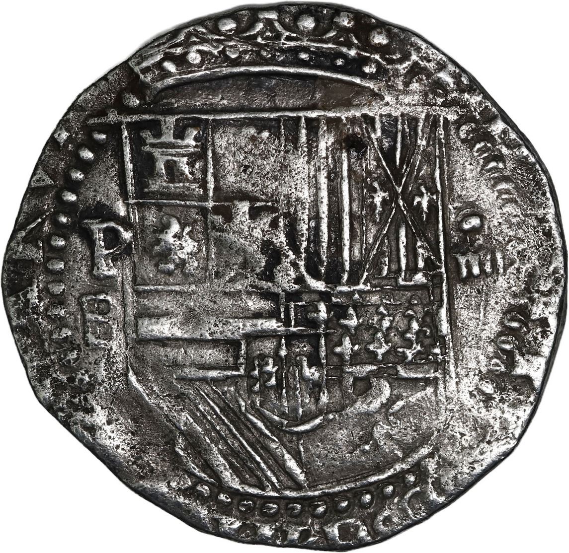 BOLIVIA, Potosí, cob 4 reales, Philip II, assayer B (3rd period). S-P10; KM-4.2; Cal-525. 13.30 grams. VF with light surface porosity, full mintmark and assayer to left of complete shield, nice cross, a few dark spots.