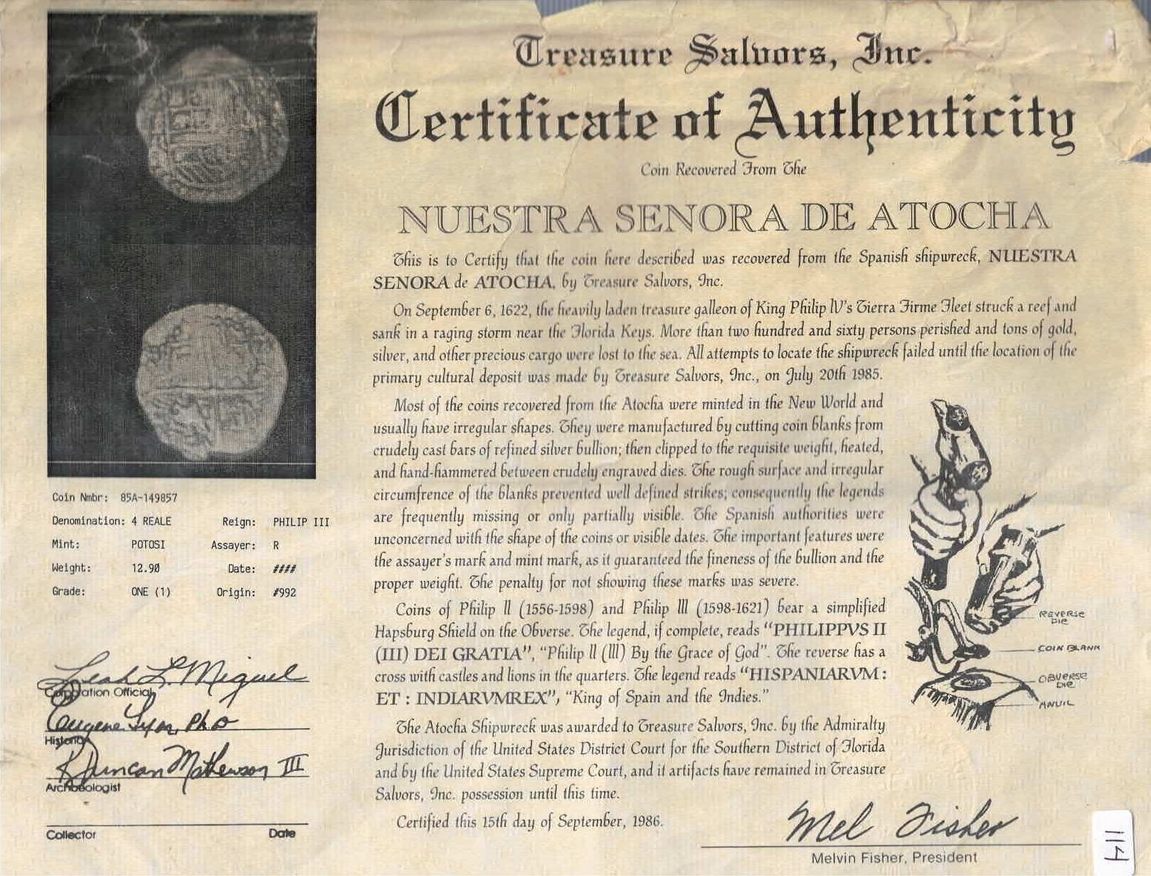 BOLIVIA, Potosí, cob 4 reales, Philip III, assayer RL (curved leg), Grade 1. S-P15; KM-9; Cal-768. 12.96 grams. Great full shield and cross, typically silvery but with minimal surface corrosion, full and clear P-RL. With original Fisher certificate 85A-149857. Recovered from: Atocha, sunk in 1622 west of Key West, Florida