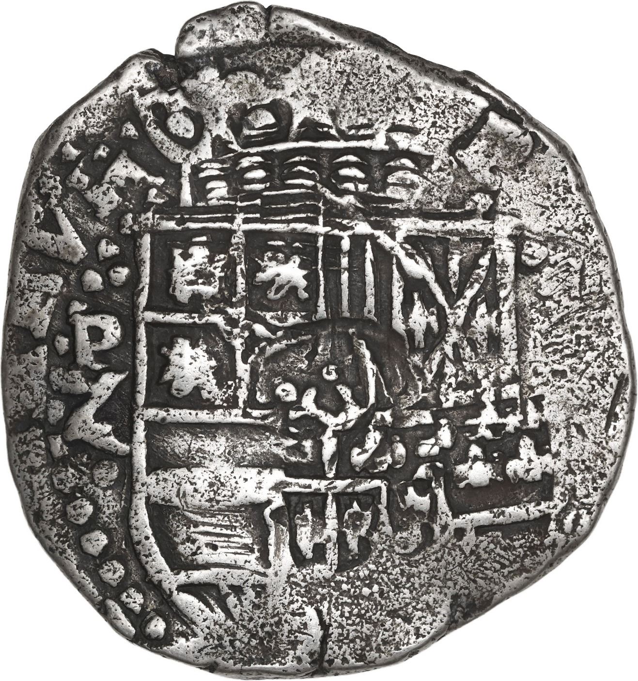BOLIVIA, Potosí, cob 8 reales, (1649) Z, with crown-alone countermark (rare variety) on shield, ex-Ponte, ex-Ponterio, Mastalir Plate. S-P34; KM-19a; Cal-1485. 26.39 grams. Solid and uncorroded, with very bold full P-Z to left of choice full shield bearing an unusual style of crown-alone countermark in center, bold full cross with scrapes from salvage, doubling on date (not visible but assumed to be 1649), contrastingly toned. Pedigreed to the Luis R. Ponte Collection and the Ponterio "La Capitana" auction of April 1999 (lot 226), also plated on page 378 of Mastalir's book The Great Transition at the Potosí Mint, 1649-1652: The 1649-1652 Crowned Shield Coinage and the Countermarks of 1652, Part B: The Countermarks of 1652 (2020). Recovered from: Capitana, sunk in 1654 off Chanduy, Ecuador
