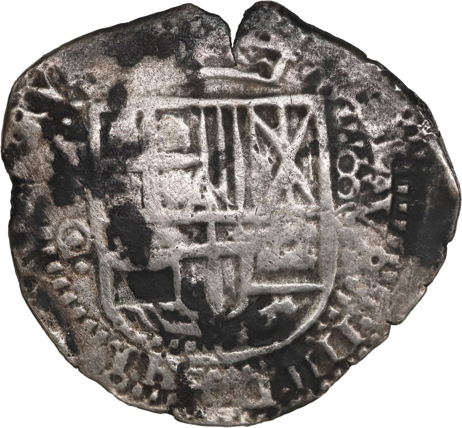 BOLIVIA, Potosí, cob 8 reales, 1650 O, with crowned-L countermark on cross, ex-Ponte, Mastalir Plate. S-P35; KM-19b; Cal-1488. 19.72 grams. Thin from corrosion and with dark patches all over but with nice full shield and cross, the latter with bold 50 of date above and full countermark on upper half, clear assayer to left and denomination to right of shield with full king's ordinal IIII in legend. Pedigreed to the Luis R. Ponte Collection and plated on page 178 of Mastalir's book The Great Transition at the Potosí Mint, 1649-1652: The 1649-1652 Crowned Shield Coinage and the Countermarks of 1652, Part A: The Crowned Shield Coinage of 1649-1652, and on page 138 of Part B: The Countermarks of 1652 (2020). Recovered from: Capitana, sunk in 1654 off Chanduy, Ecuador