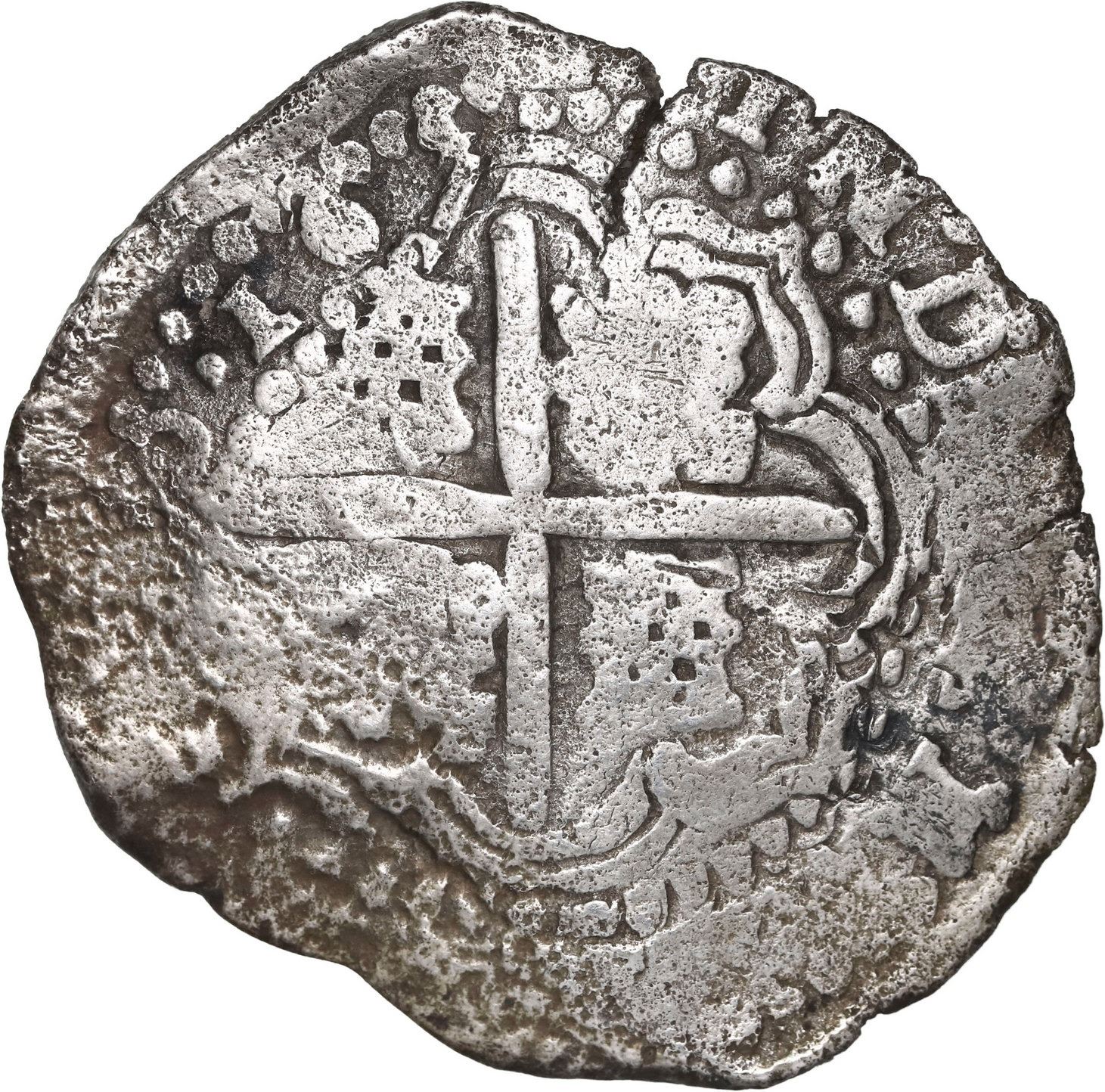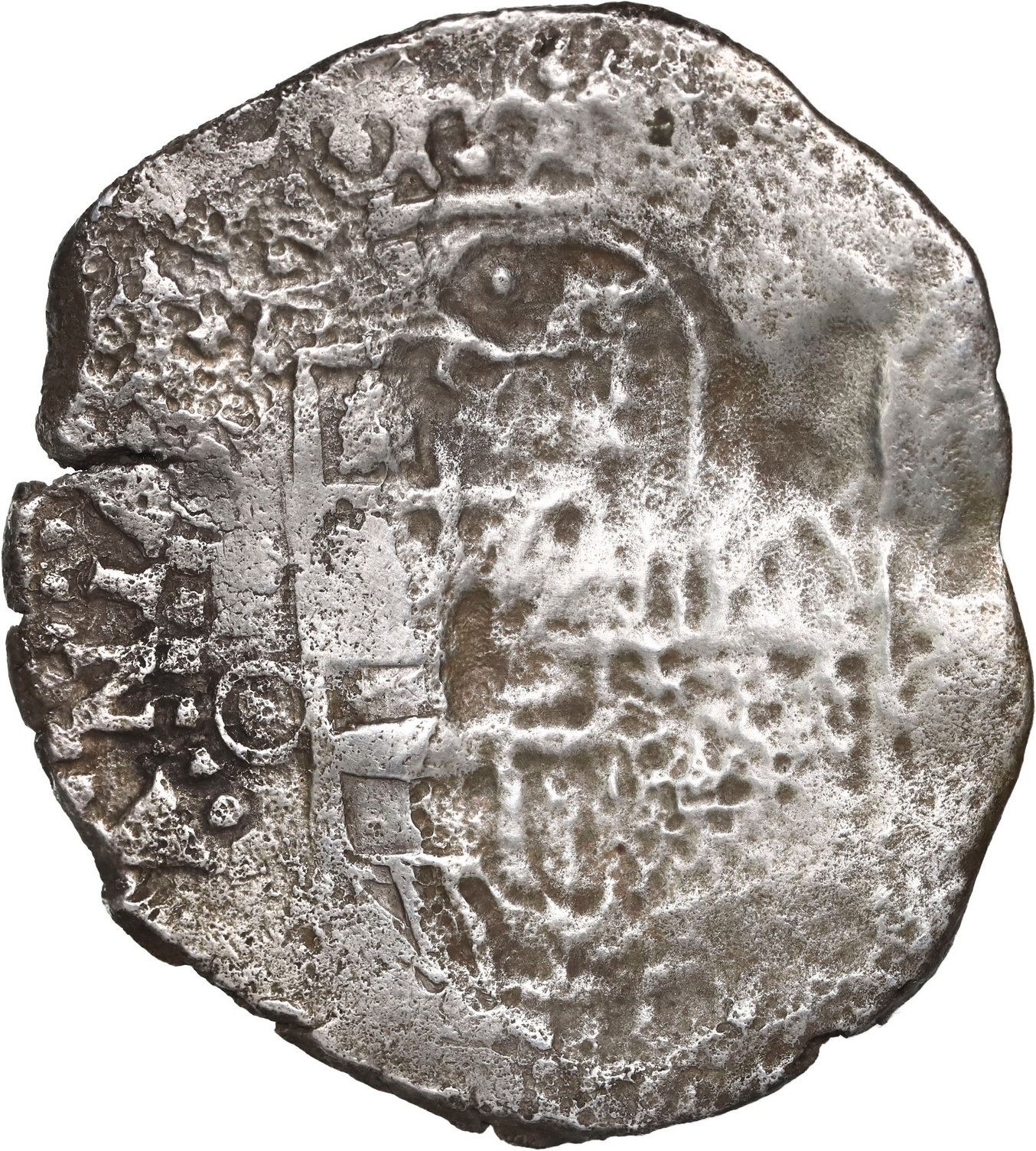 BOLIVIA, Potosí, cob 8 reales, 1650 (Spanish 5) O, with crowned-•F• countermark on shield. S-P35; KM-19b; Cal-1488. 22.12 grams. Full but moderately corroded shield with most of countermark visible at top, full 165 of date outside of full but weakly struck cross, minor edge-split, traces of toning in crevices. Pedigreed to the Robert McClung Collection. Recovered from: Capitana, sunk in 1654 off Chanduy, Ecuador