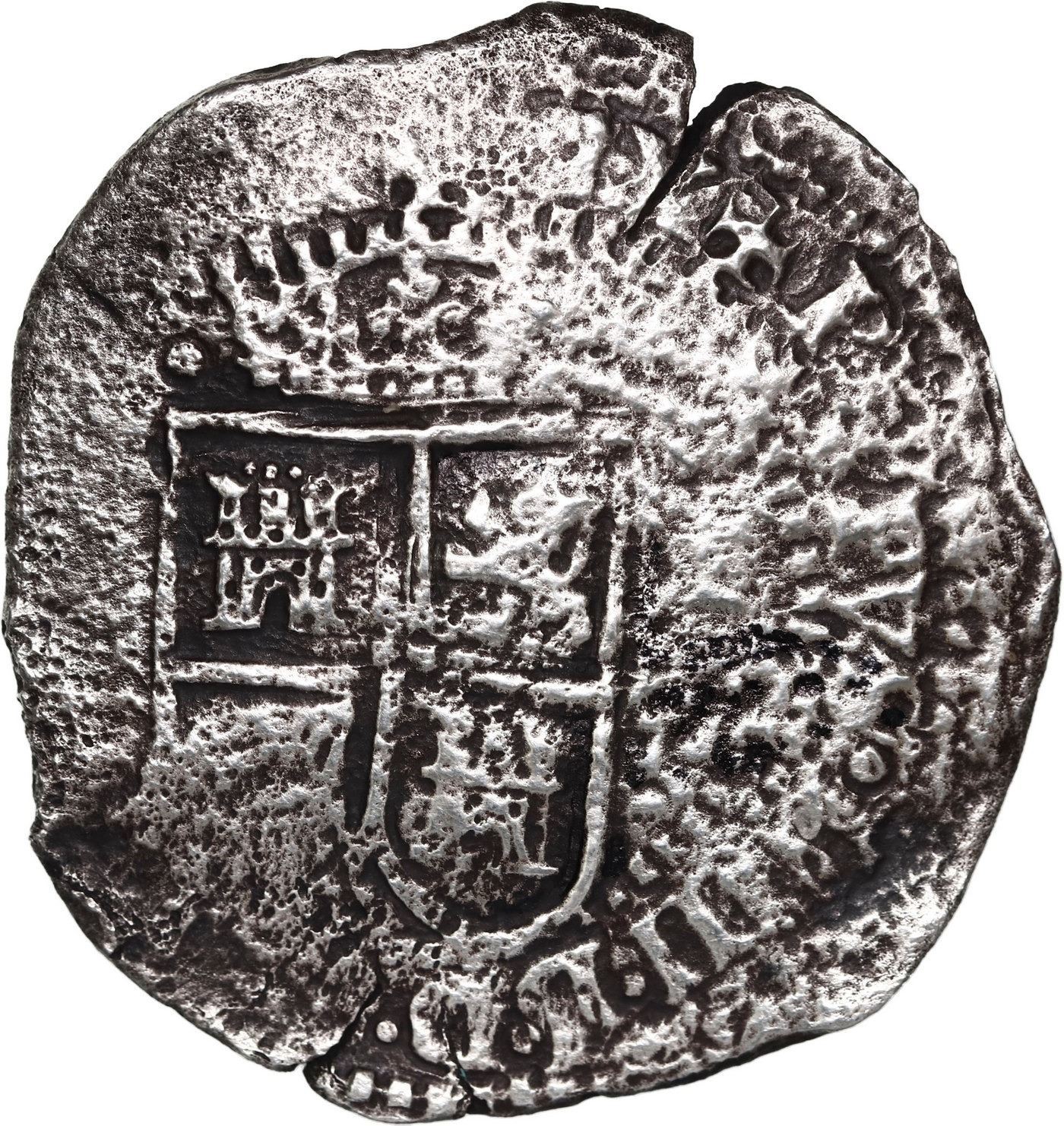 BOLIVIA, Potosí, cob 8 reales, 1652 E, Transitional Type IV/A. S-P37; KM-A20.4; Cal-1493. 22.41 grams. Broad flan with very darkly toned fields for great contrast, excellent full pillars-and-waves and crown, the shield and its crown also full but a bit corroded and off-center enough to allow a full but doubled king's name and ordinal in legend, minor edge-splits. Pedigreed to the Robert McClung Collection. Recovered from: Capitana, sunk in 1654 off Chanduy, Ecuador
